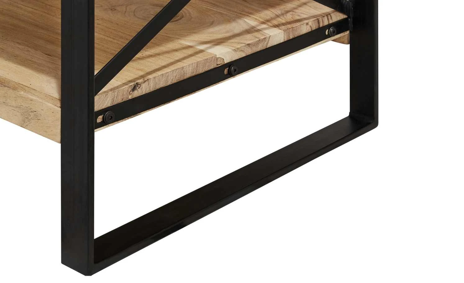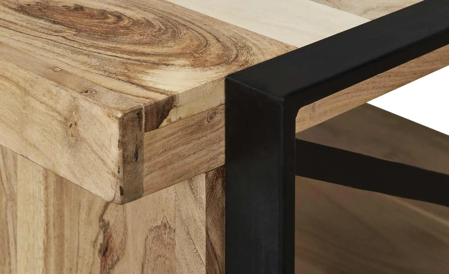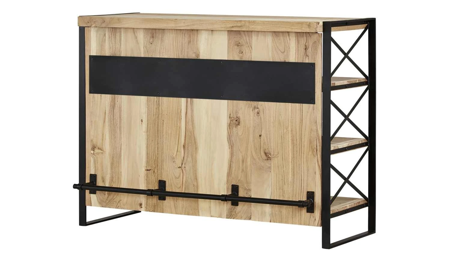 - Mehr zum Material: Fußstange und Zierblende: Metall, lackiert, Ablageplatten, Tischplatte und Front: Akazie natur massiv, gebeizt und lackiert