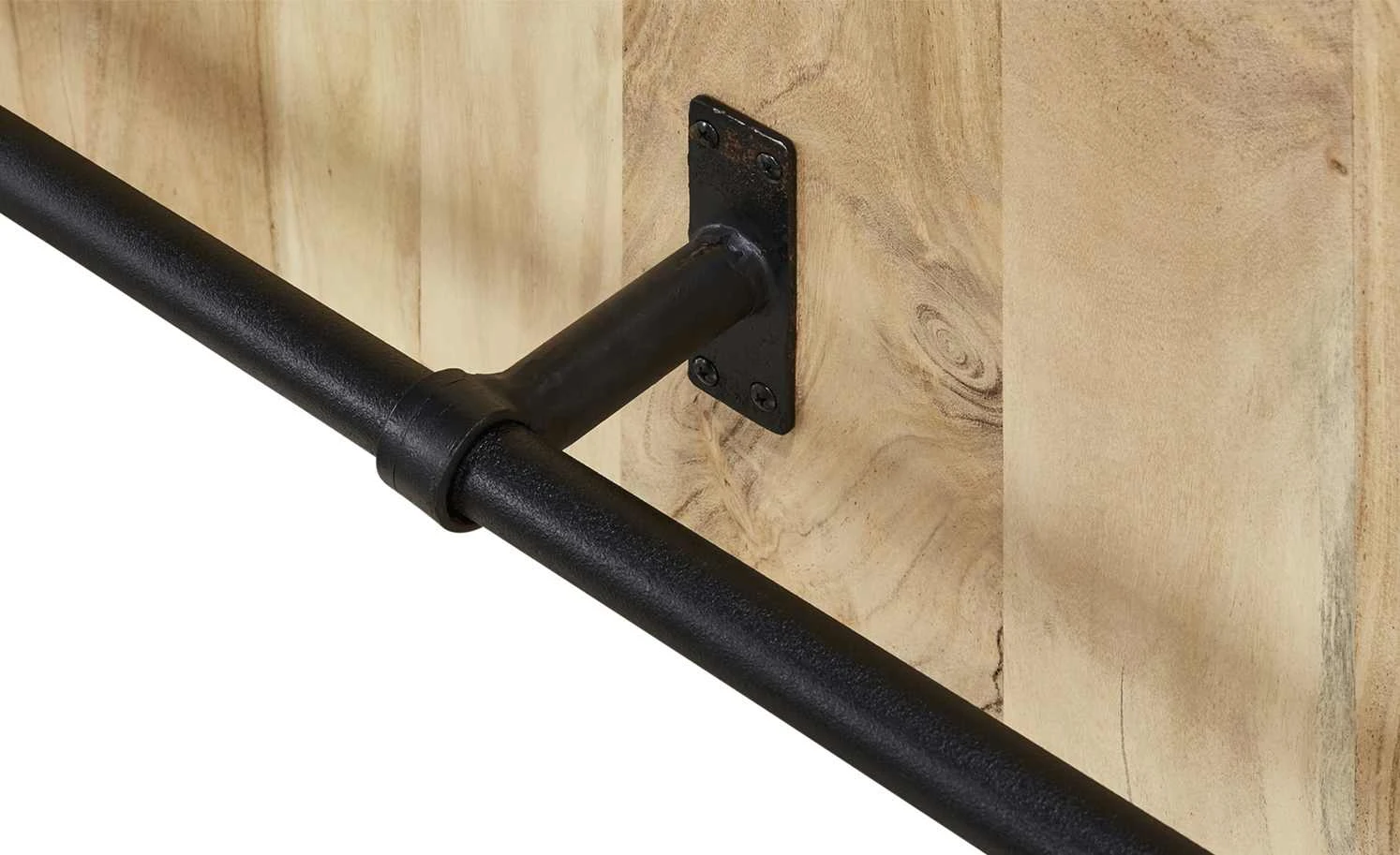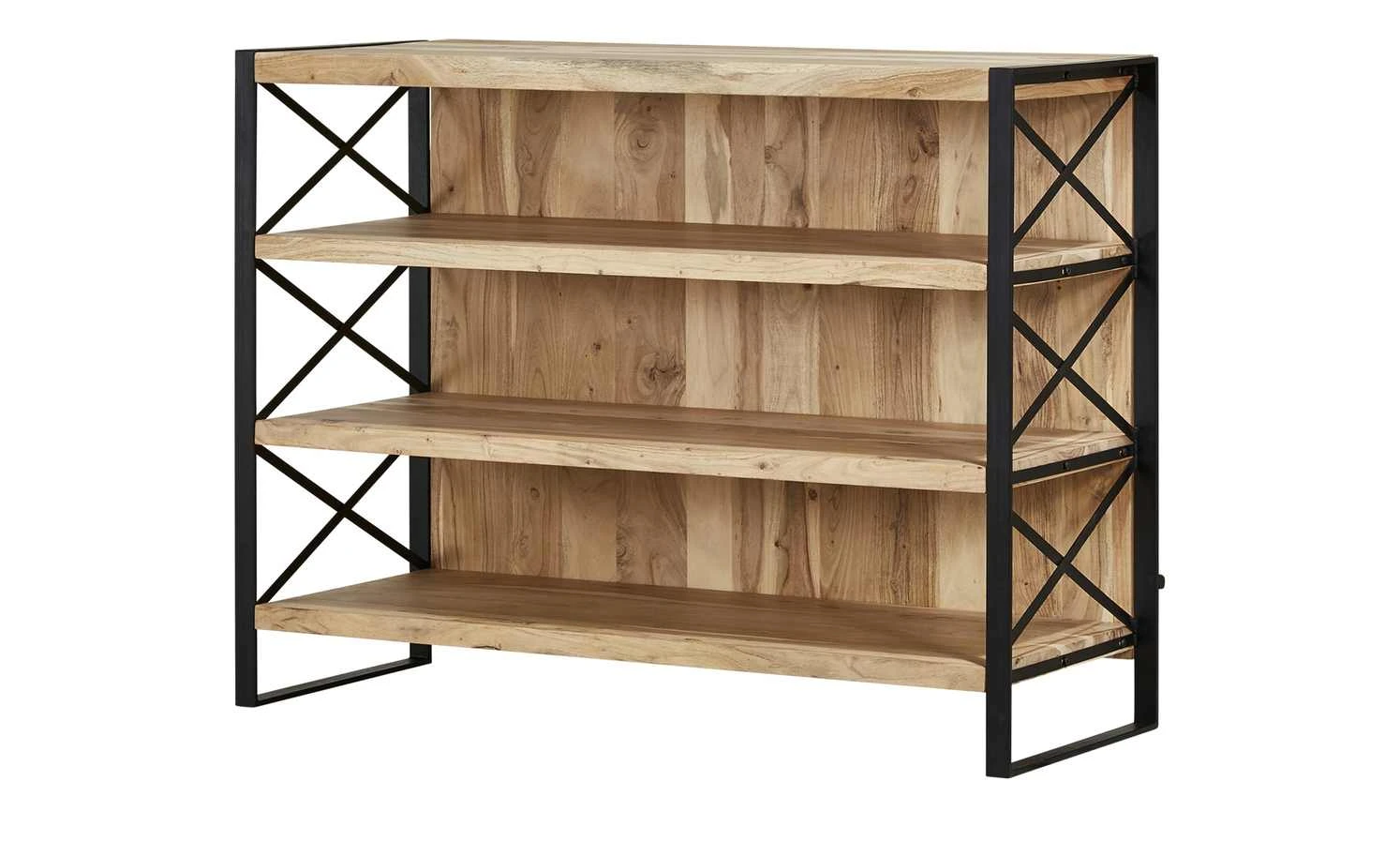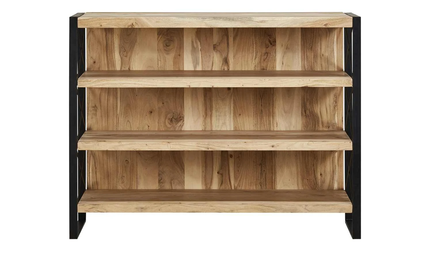 - Mehr zum Material: Fußstange und Zierblende: Metall, lackiert, Ablageplatten, Tischplatte und Front: Akazie natur massiv, gebeizt und lackiert
