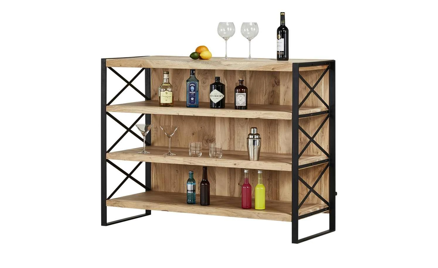 Eine Bar im Wohnzimmer ist schon etwas ganz besonderes. Und wenn sie dann auch noch im Industrial-Look daherkommt, dann sind Ihnen neidische Blicke garantiert. Wie zum Beispiel mit der Bar Queens und ihrem Materialmix. Die Holzflächen bestehen aus massiver Akazie. Sie ist stabil, langlebig und verfügt über eine rustikale Maserung mit Farbunterschieden und Asteinschlüssen. Das Holz ist gebeizt und lackiert. Hinzu kommen Seiten und Akzente aus schwarzem Metall. Sie setzen sich vom hellen Holz ab und zaubern den besonderen Industrie-Charme. Queens verfügt über drei große offene Fächer. Die Abdeckplatte dient als Tresen.