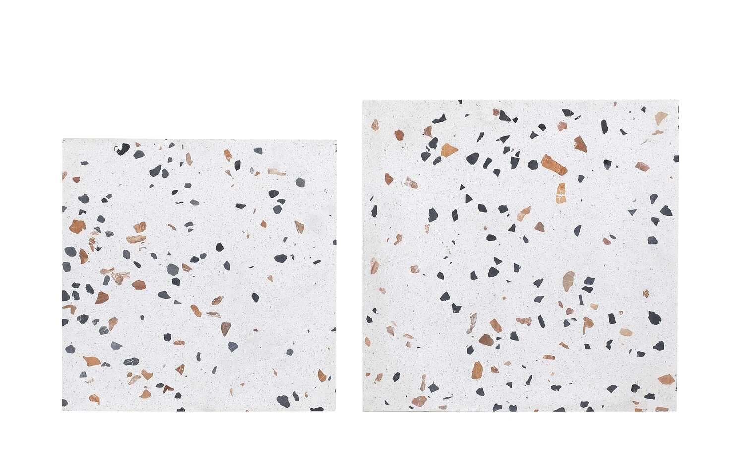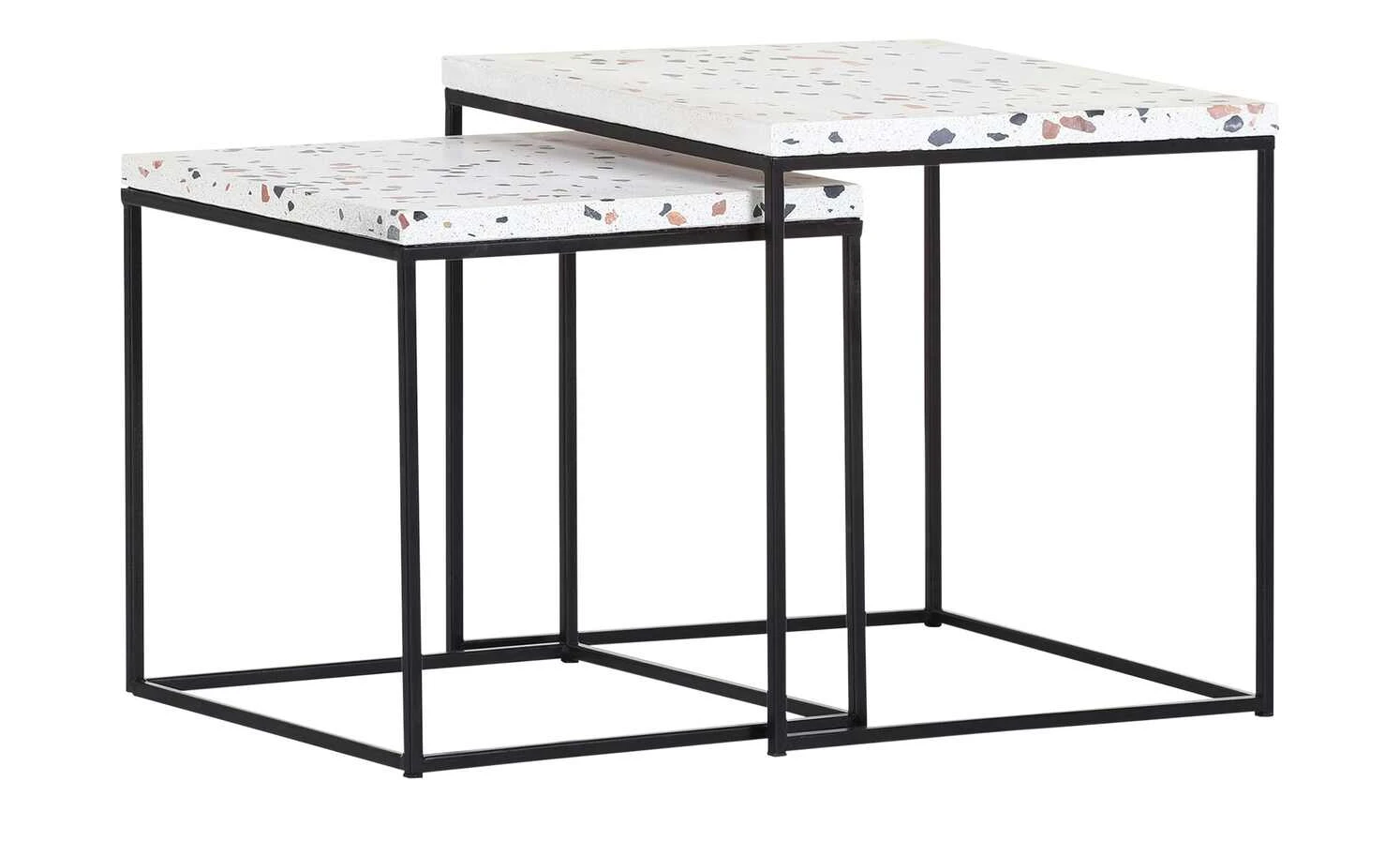 Diese beiden Beistelltische stechen durch ihre Terrazzo-Machart sofort ins Auge. Die quadratischen, weißen Tischplatten sind mit trendigen, unregelmäßig verteilten Farbakzenten versehen. Getragen werden sie von kubistischen Metallgestellen in Schwarz, welche einen bewussten Kontrast bilden. Schieben Sie den kleineren Tisch ganz einfach unter den größeren oder platzieren Sie die Tische separat voneinander: Ihrer Gestaltungsfreiheit sind keine Grenzen gesetzt.