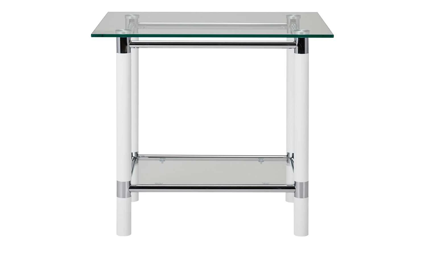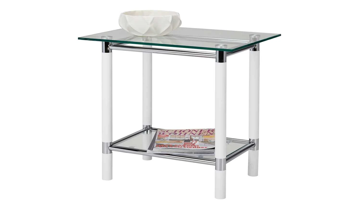 Der Beistelltisch bietet zusätzliche Stell- und Ablageflächen – und das in jedem beliebigen Raum. Dank des zeitlosen Designs können Sie ihn wunderbar mit vorhandenen Einrichtungen kombinieren. Tischplatte und Ablage bestehen aus neutralem Klarglas. Es zeichnet sich durch Robustheit aus und lässt sich leicht pflegen. Das Gestell aus Metall ist mattweiß lackiert und wird von Chromakzenten abgesetzt.