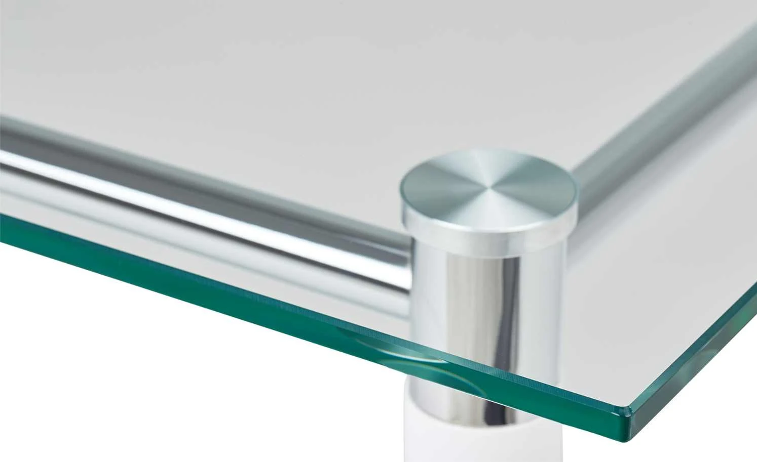 - Mehr zum Material: Tischplatte aus Klarglas, Applikationen: Metall, verchromt
