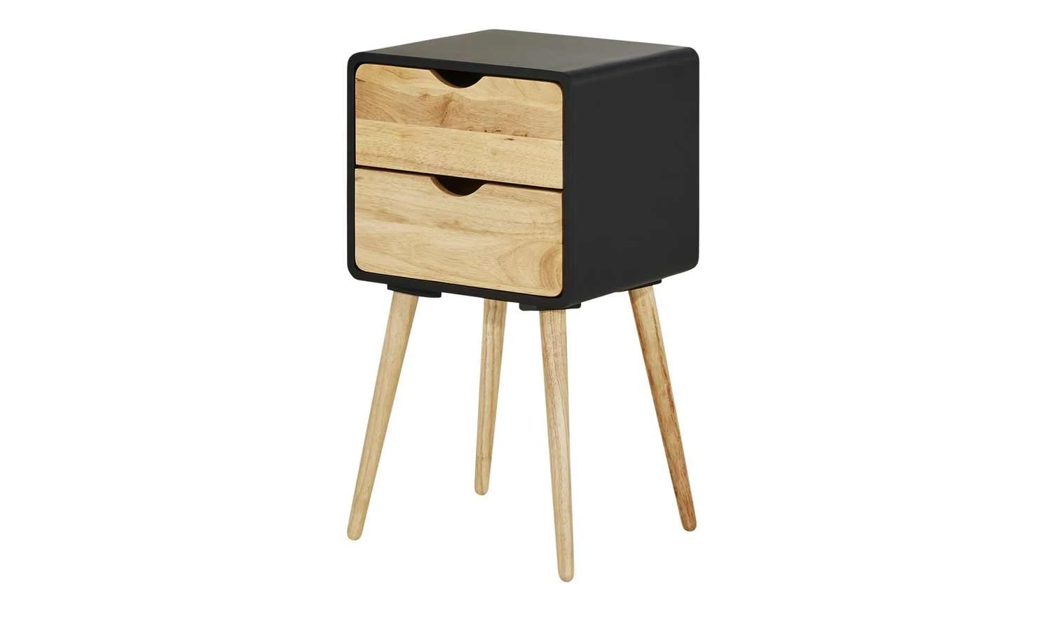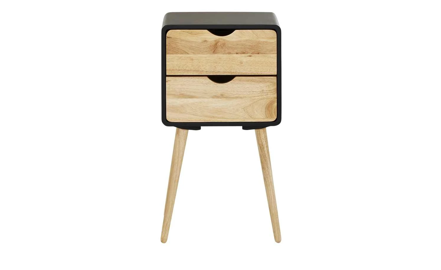 Der Beistelltisch Cassarina hat ein frisches, modernes Scandi-Design. Front und Gestell bestehen aus naturbelassenem Gummibaum. Der Tischplatte und Korpus setzen sich in Schwarz ab. Sie sind lackiert. Cassarina bietet – neben der Ablagefläche der Tischplatte – Stauraum in zwei Schubladen.