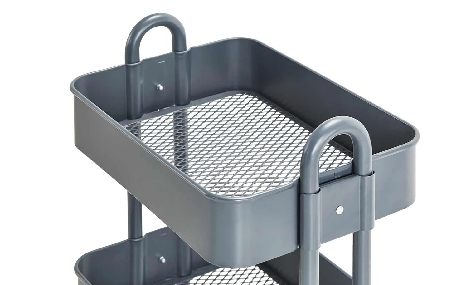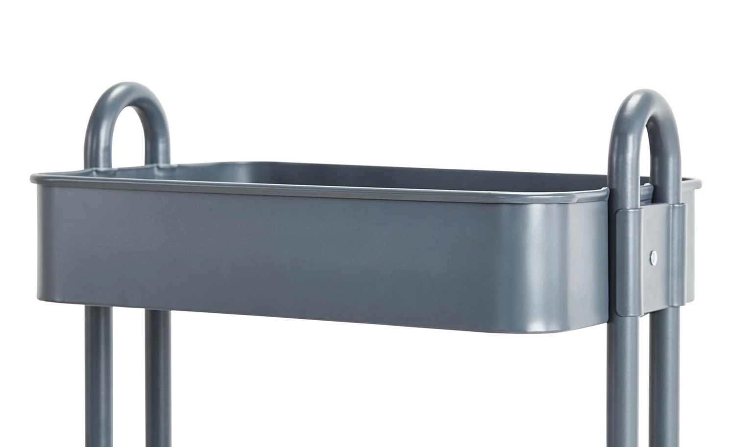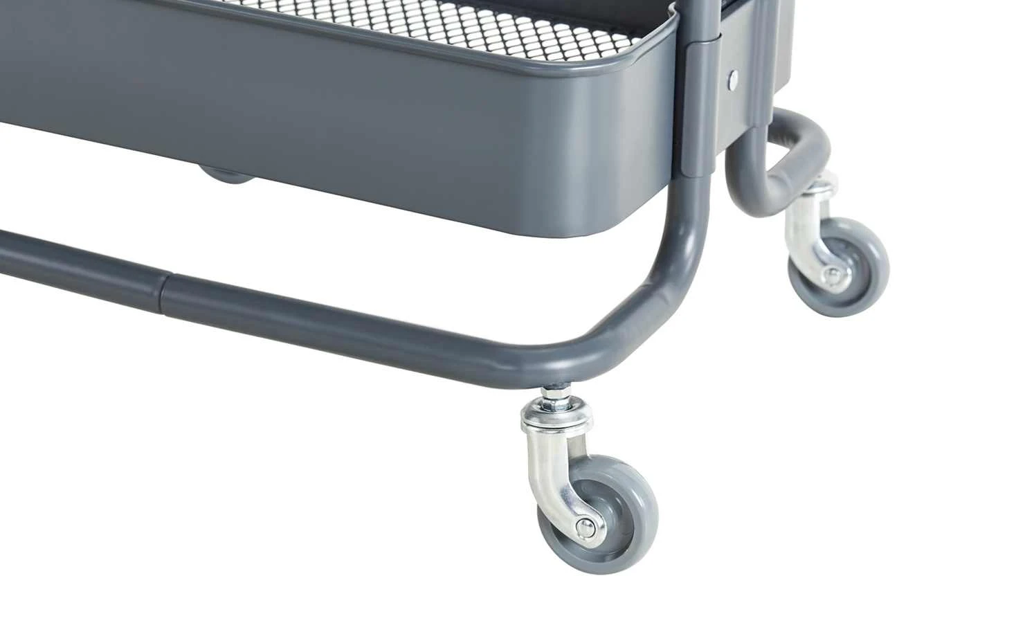 Richtig praktisch ist der Beistelltisch Grigio. Durch die Rollen können Sie ihn dorthin rollen, wo Sie ihn benötigen. Grigio verfügt über drei Ablagen mit einem erhöhten Rand. Ablagen und Gestell sind aus lackiertem Metall.