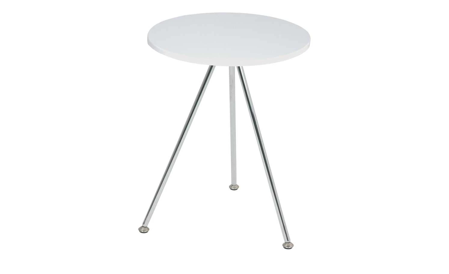 Hürth ist ein moderner kleiner Beistelltisch. Die runde Tischplatte fällt durch ihr strahlendes Weiß auf. Durch das Hochglanzfinish wirkt der Farbton noch leuchtender und eleganter. Drei Tischbeine aus verchromtem Metall sorgen für einen soliden Stand und setzen sich dekorativ ab.