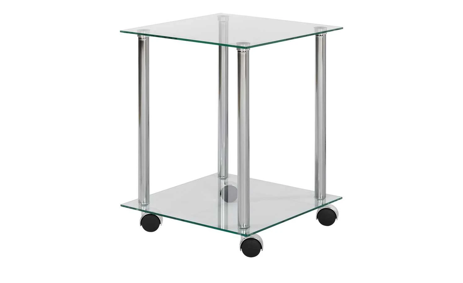 Der Beistellwagen im schlichten Design aus Glas und Metall kann durch seine vier Rollen flexibel platziert werden. Die Metallstreben des Tisches sind verchromt und er verfügt über zwei Glasablageflächen aus Sicherheitsglas