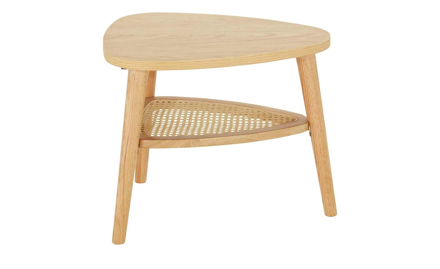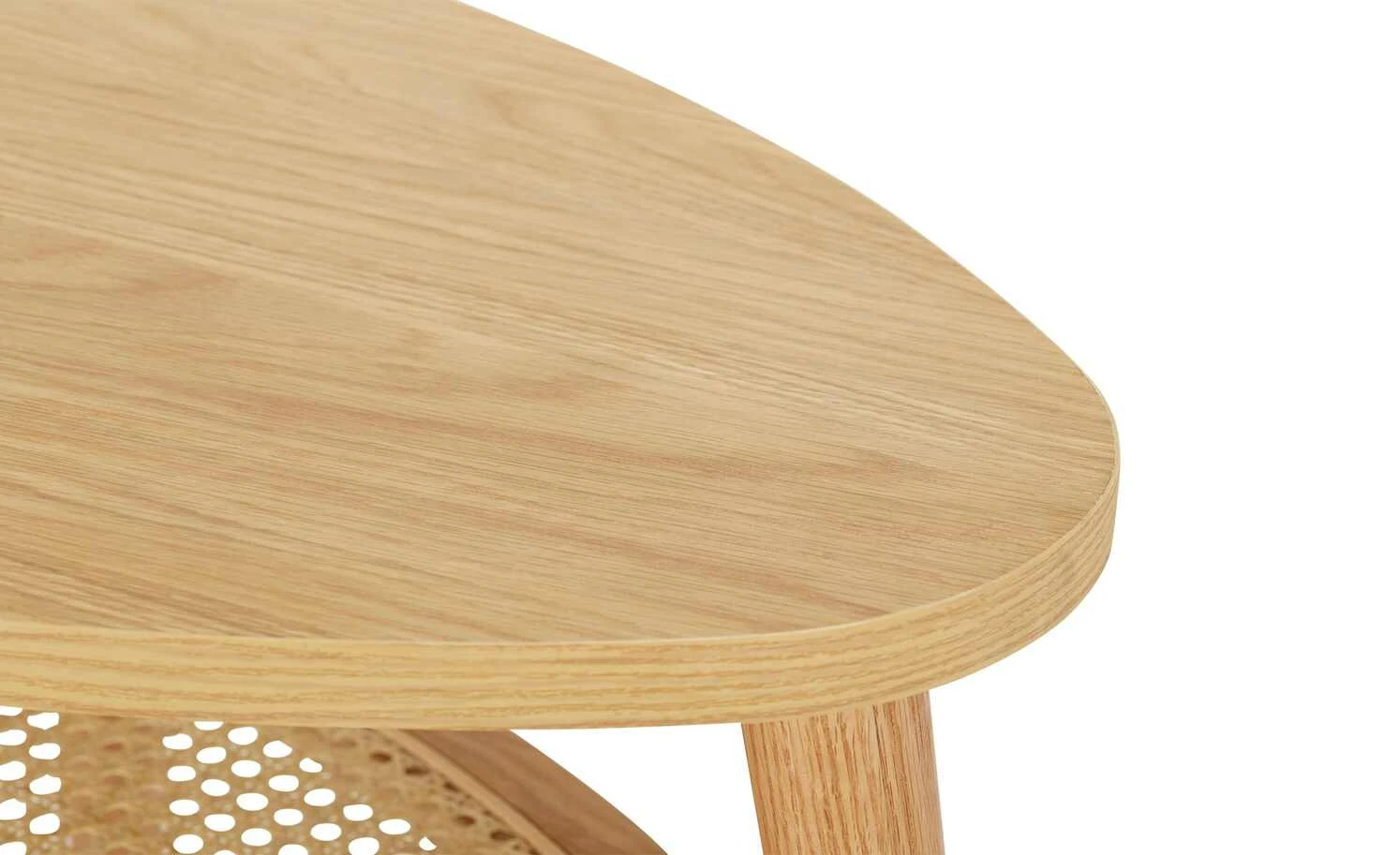 Natürliches Eichenholz in Kombination mit hellem Rattan: Das ist der Beistelltisch Panarea. Seine dreieckige Tischplatte ist mit massivem Eichenholz furniert und bietet Platz für Lektüre und Co. Direkt unter der Tischplatte befindet sich eine zusätzliche Ablagefläche aus Rattan: Dieses wurde im Stil vom Wiener Geflecht gearbeitet. Dafür wurden aus sechs Strängen Rattan die markanten Achtecke geflochten – Das Markenzeichen des Wiener Geflechts. Der freundliche Beistelltisch steht auf drei robusten Füßen aus Eichen-Massivholz.