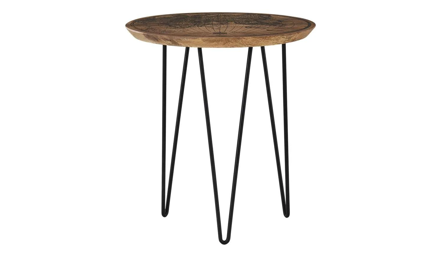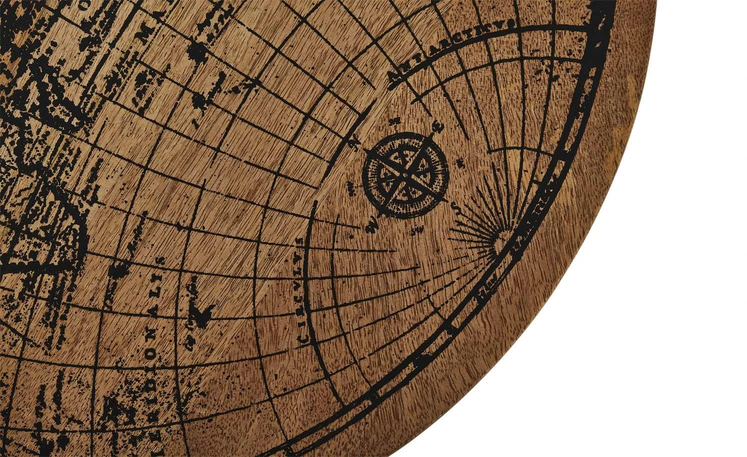 Eyecatcher des Beistelltisches Piazza: die Tischplatte. Sie ist mit einer Weltkarte bedruckt – komplett mit Breiten- und Längengraden und nautischer Rose. Die Tischplatte selbst besteht aus massivem Mangoholz und ist gebeizt und anschließend lackiert worden. Die drei Tischbeine sind aus Metall gefertigt.