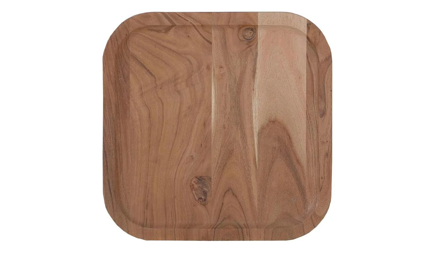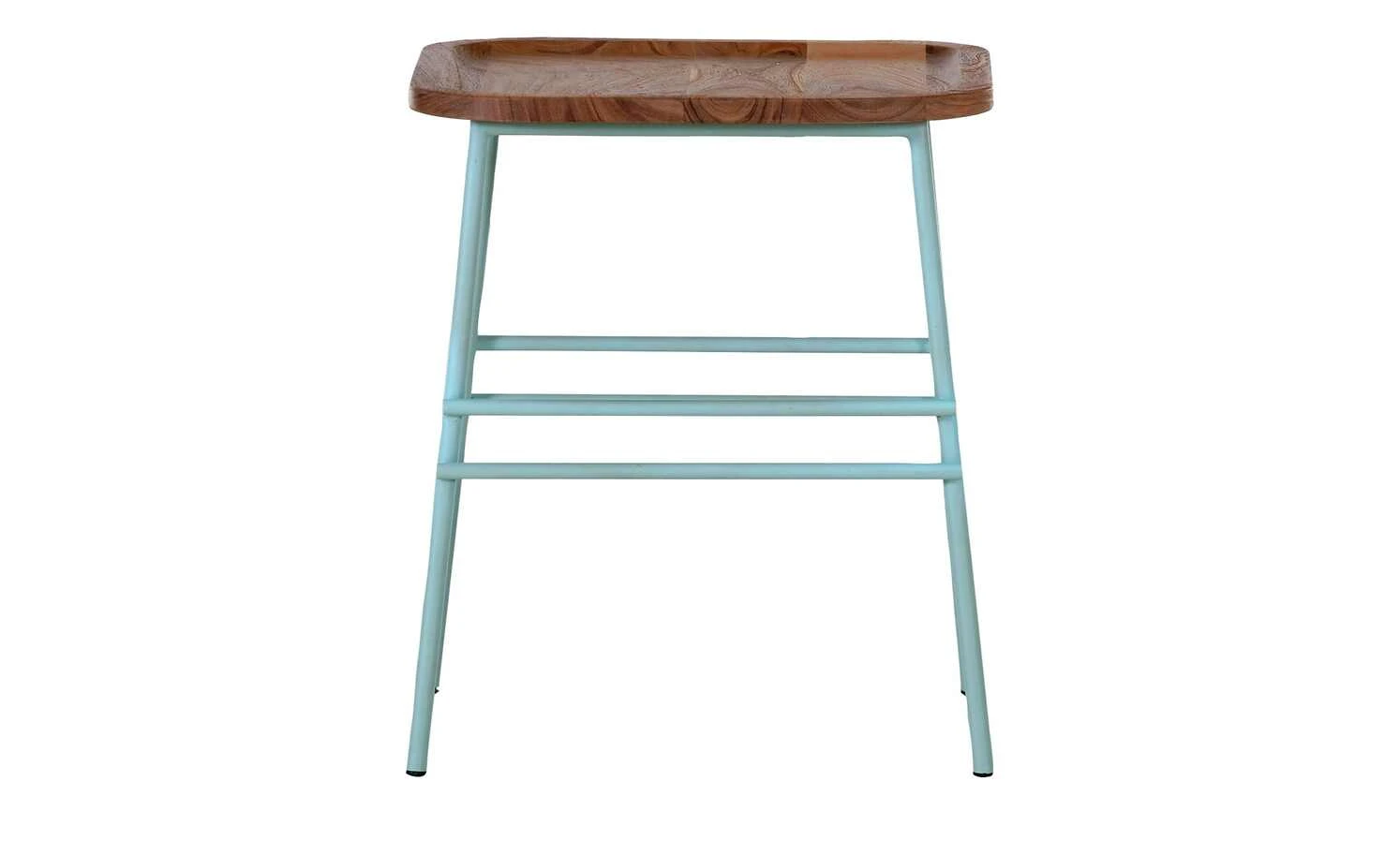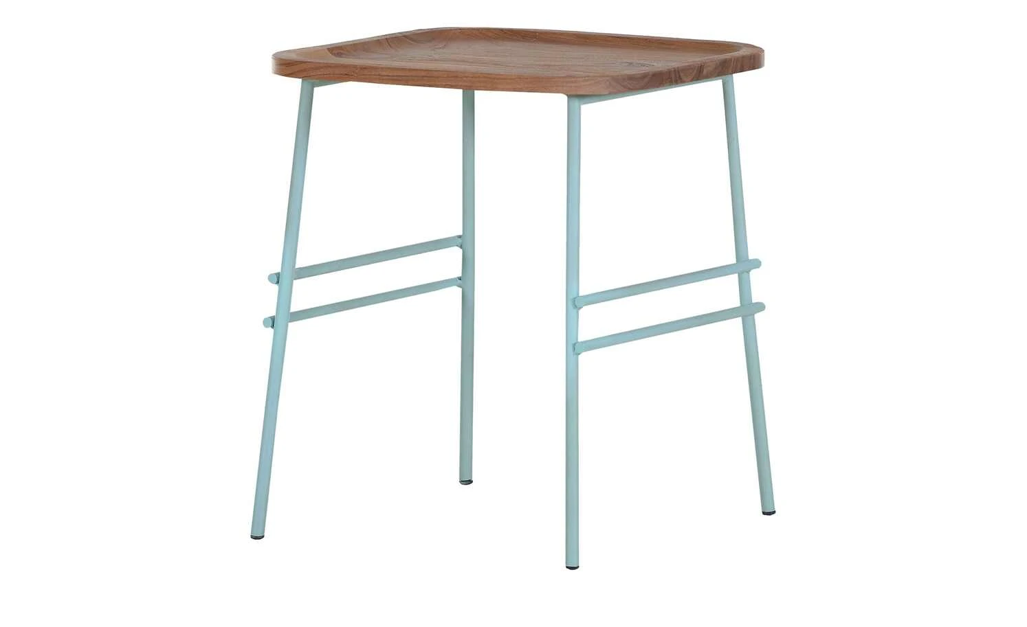 Ein A-förmiges Metallgestell in Türkis trägt die Tischplatte aus massivem Akazienholz. Die 45 x 45 Zentimeter große Holztischplatte wurde zum Schutz lackiert und besitzt ein attraktives smoked-Finish. Unser Tipp: Setzen Sie weitere Akzente mit der Möbelserie Talia. Frische Farben und junges, modernes Design zeichnen die Möbel der Serie aus.