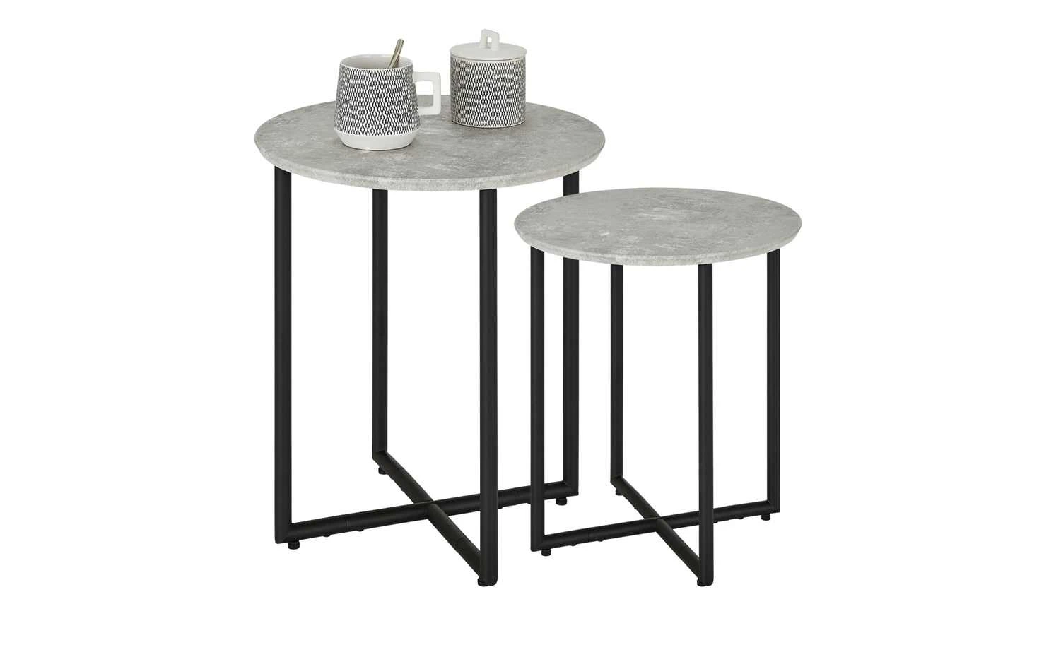 Die beiden Beistelltisch Anik ergänzen sich perfekt. Der kleine Tisch kann teilweise unter den großen Tisch geschoben werden, aber Sie können die beiden auch gerne einzeln platzieren. Ganz wie Sie mögen. Die Tischplatten sind rund und haben ein modernes Beton-Dekor (Nachbildung). Es wird vom schwarzen Kufengestell abgesetzt. Es ist pulverbeschichtet und hat ein mattes Finish.