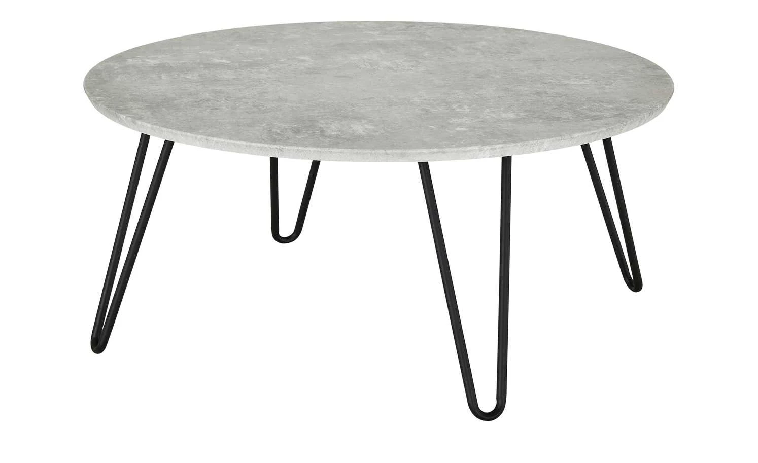 Angus ist ein Couchtisch mit modernem Gesamtlook. Die runde Tischplatte hat ein Dekor in Beton (Nachbildung). Die vier Tischbeine setzen sich davon in Schwarz ab. Sie sind offen und luftig gestaltet. Durch das stabile Metall sorgen sie dabei aber für einen soliden Stand.