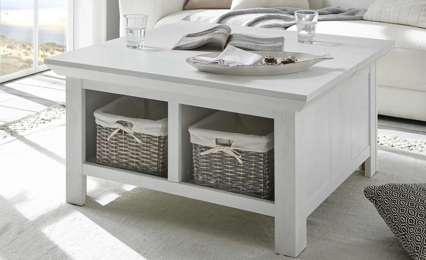 Der Couchtisch Atina ist im Landhausstil designt, wirkt dabei aber dezent und geradlinig. Er hat ein Dekor in weißer Pinie (Nachbildung), das über eine feine Maserung verfügt. Die quadratische Tischplatte ist zweigeteilt. Eine Seite lässt sich aufklappen, so dass Sie an den Stauraum darunter gelangen. Auf der anderen Seite befinden sich zwei seitlich zugängliche Fächer.