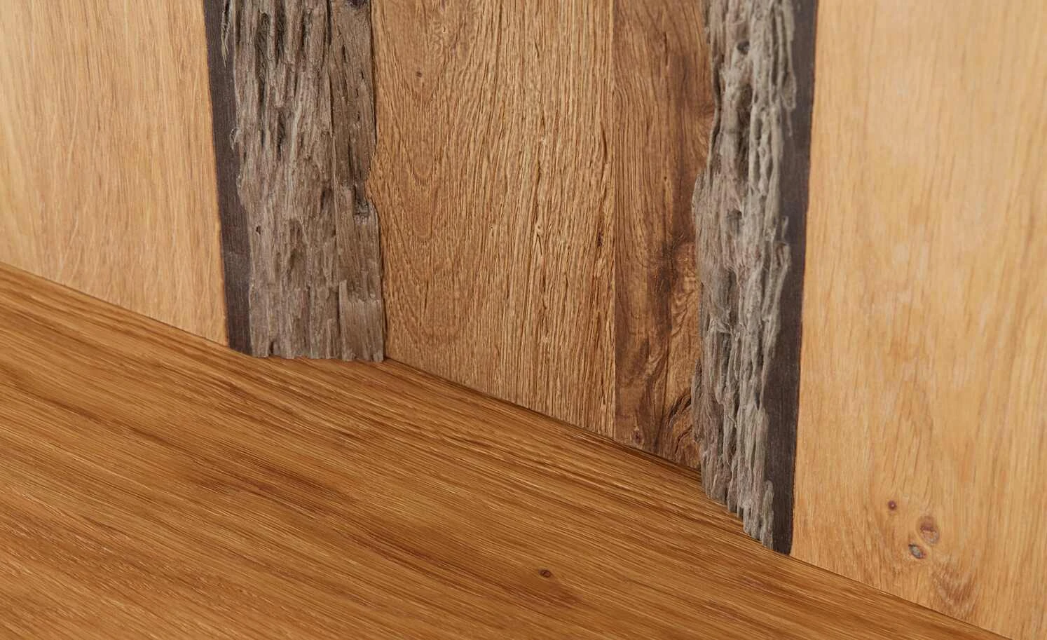 - Mehr zum Material: Akzent: naturgetreue authentische Waldkante (furniert), Salzkammergut Alteiche natur (furniert) gebürstet, Nische: Balkeneiche Vintage Grau (furniert)