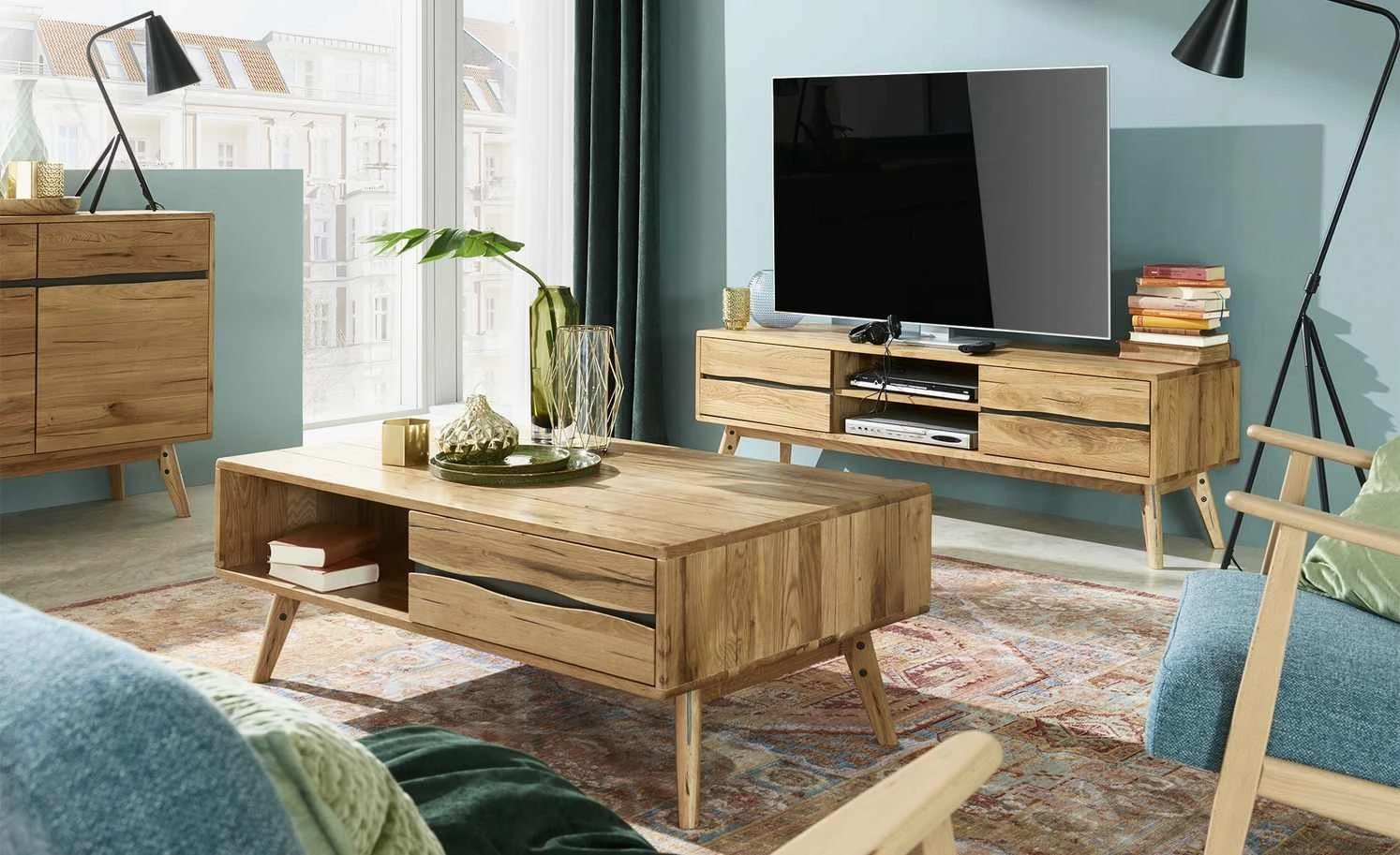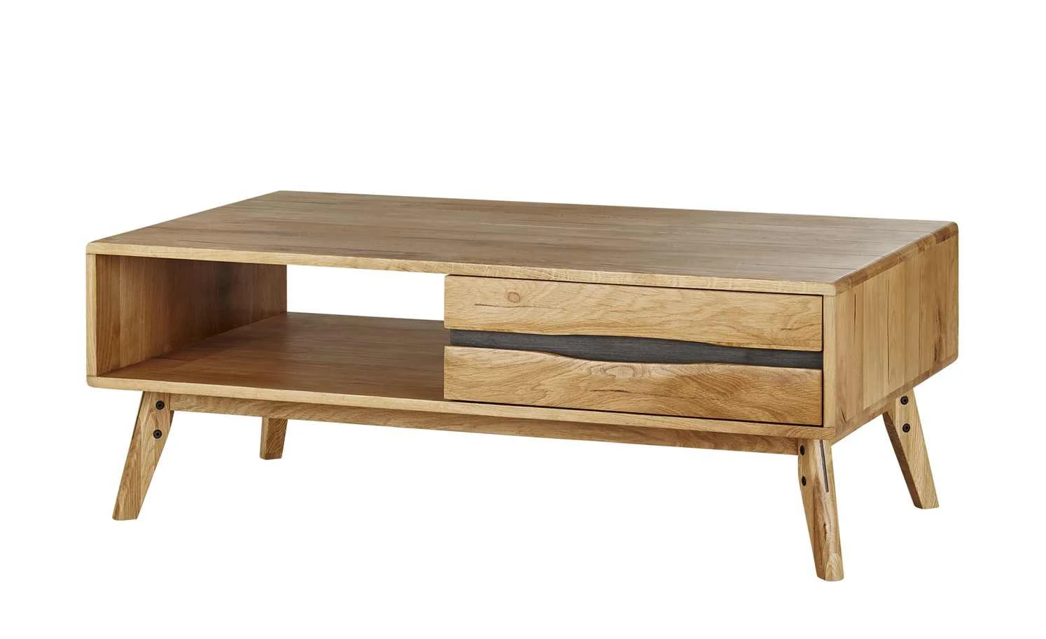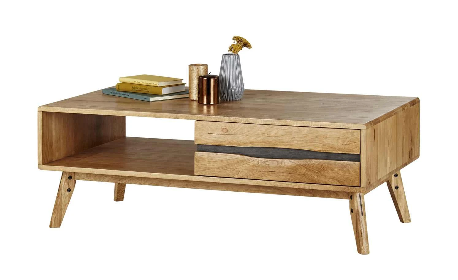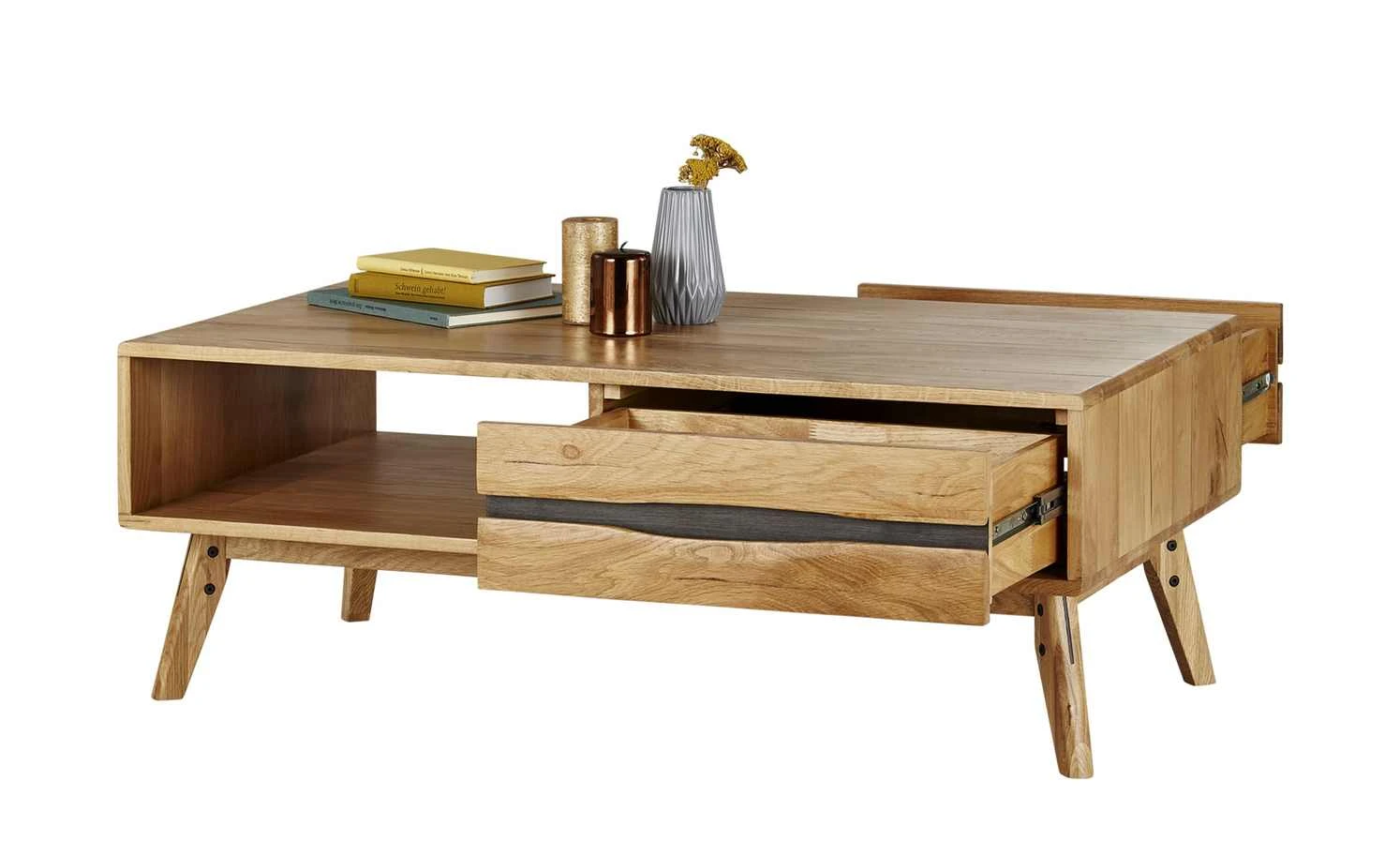 Dank seines stylischen Designs ist der Couchtisch Cinnamon ein natürlicher Eyecatcher für den Wohnraum. Der Tisch besteht zum größten Teil aus massiver Wildeiche. Die Ablageplatte ist mit Wildeiche furniert und mit künstlichen Rissen versehen – So entsteht eine charmante Note. Alle Holzoberflächen sind zum Schutz lackiert worden, damit Sie Flüssigkeiten und andere Kleckerunfälle mühelos wegwischen können. Cinnamon verfügt über eine offene Ablage und zwei Schubfächer. Die Schubfächer sind mittig in der länglichen Griffmulde grau abgesetzt.