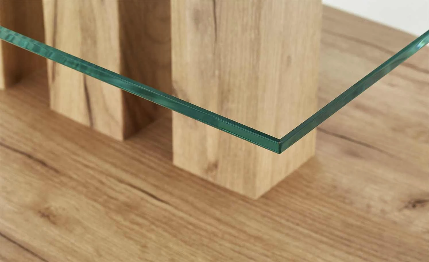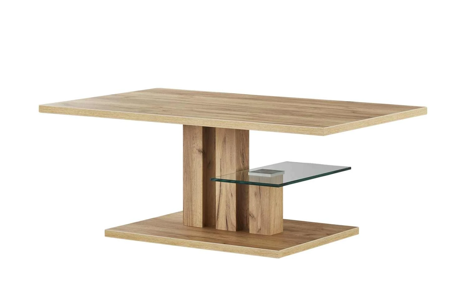 Der Couchtisch Cortina verfügt über eine kleine Ablage aus Glas. Der Rest des Tisches hat ein attraktives Dekor in Wildeiche (Nachbildung). Das Gestell hat eine Säulenform mit Bodenplatte. Dabei tragen drei Säulen Tischplatte und Ablage.