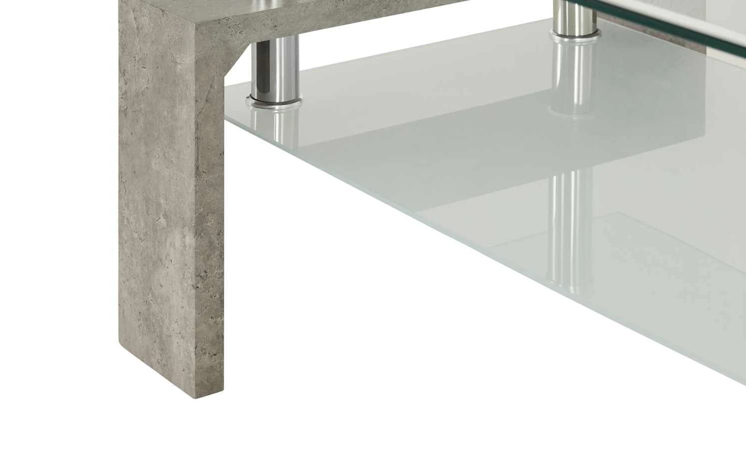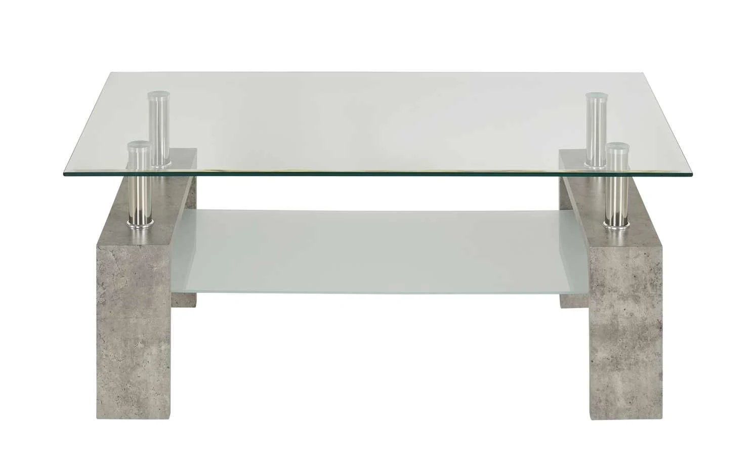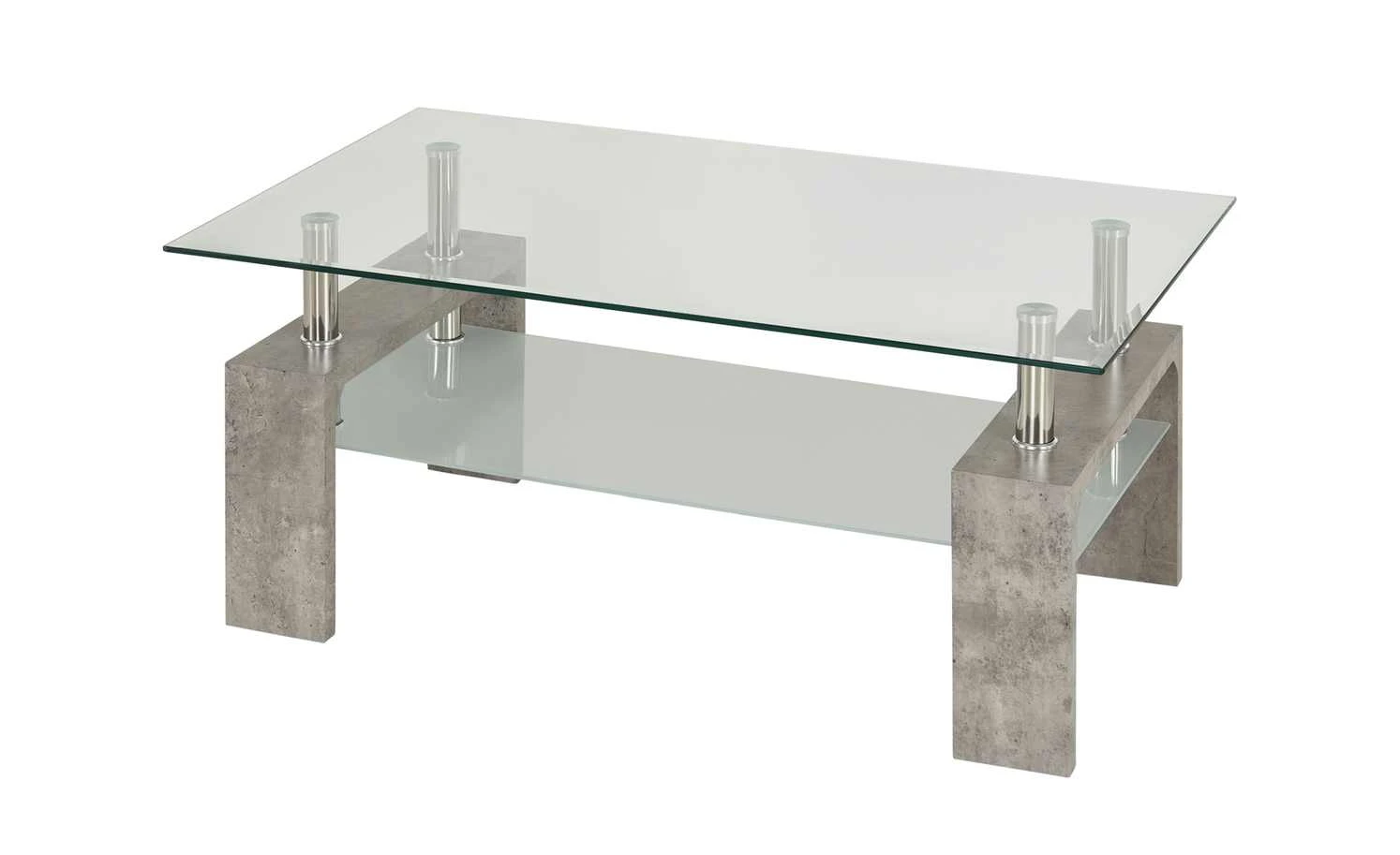 Ein modernes, gradliniges Design macht den Couchtisch Elba zum Highlight des Wohnzimmers. Das Gestell hat eine auffällige Betonoptik. Durch die beschichtete Oberfläche ist es strapazierfähig. Die zylinderförmigen Absetzungen sind aus Edelstahl und poliert. So setzen sie sich vom Gestell ab. Die eckige Tischplatte aus Klarglas verfügt über einen Facettenschliff am Rand. Durch die Verwendung von Glas ist die Tischplatte besonders pflegeleicht. Etwaige Flecken brauchen Sie einfach nur mit einem feuchten Tuch abzuwischen. Elba hat außerdem eine Ablage, auf der Sie Bücher oder Zeitschriften platzieren können. Die Ablage ist aus satiniertem Glas und setzt sich somit von der Tischplatte ab.