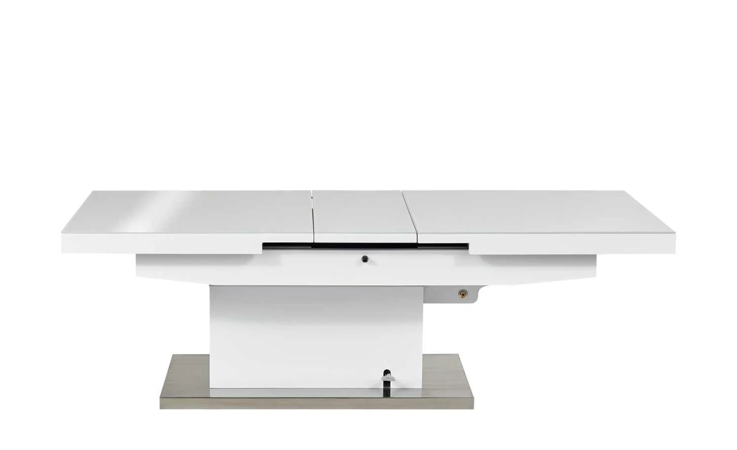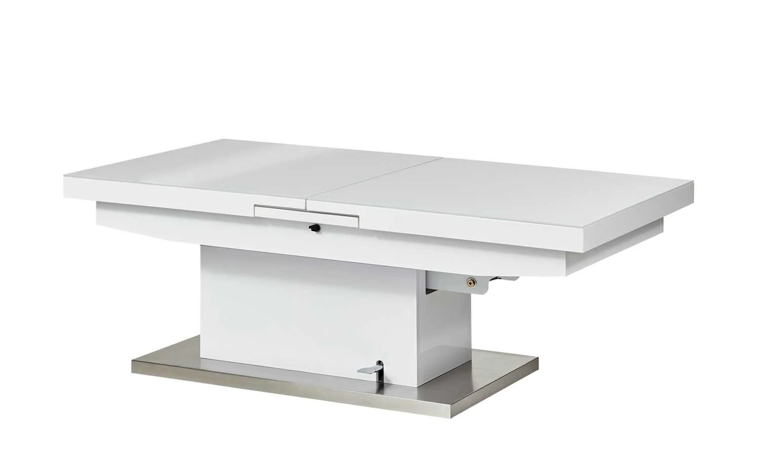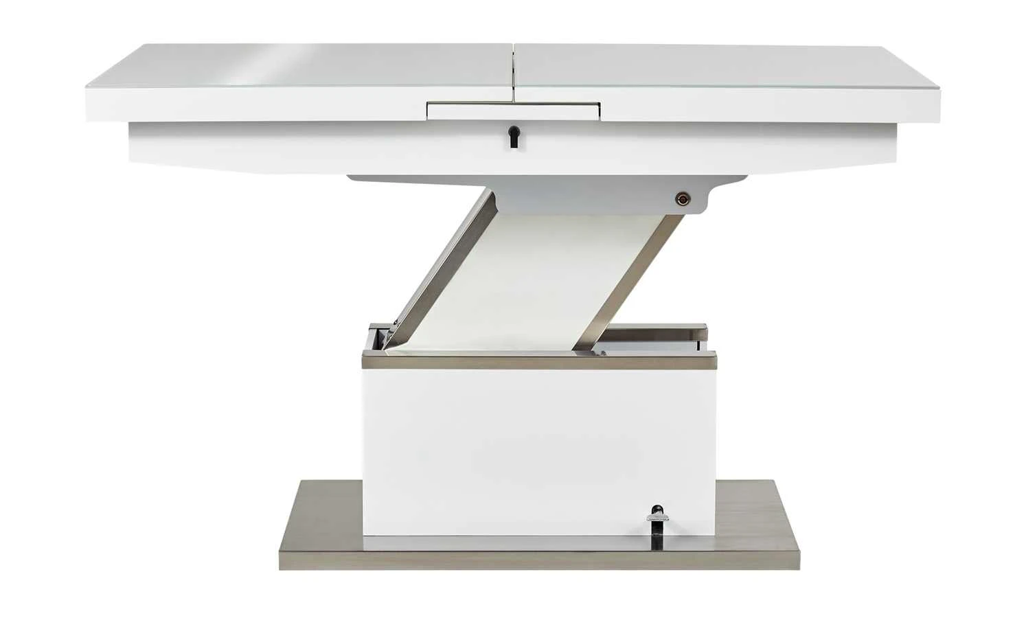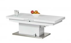Grado ist Couch- und Esstisch in einem. Wie das geht? Sie können den Tisch ganz nach Bedarf in der Höhe und Länge variieren. Die Höhe des Tisches ist zwischen 47,5 bis 75 Zentimetern anpassbar. Dazu brauchen Sie einfach nur das Pedal betätigen und die Tischplatte auf die gewünschte Höhe hochziehen. Um die Tischplatte auszuziehen, wird der kleine Knopf an der Tischseite gedrückt und schon können Sie beide Tischseiten auseinanderziehen. Danach wird die mittige Einlegeplatte zwischen die beiden Tischenden geschoben. Das Gestell des Tisches ist weiß lackiert und hat ein edles Hochglanzfinish. Die Tischplatte besteht aus Weißglas und greift somit den Farbton des Gestelles wieder auf. Der Fußsockel und die Absetzungen am ausgezogenen Gestell sind aus Metall und matt gebürstet.