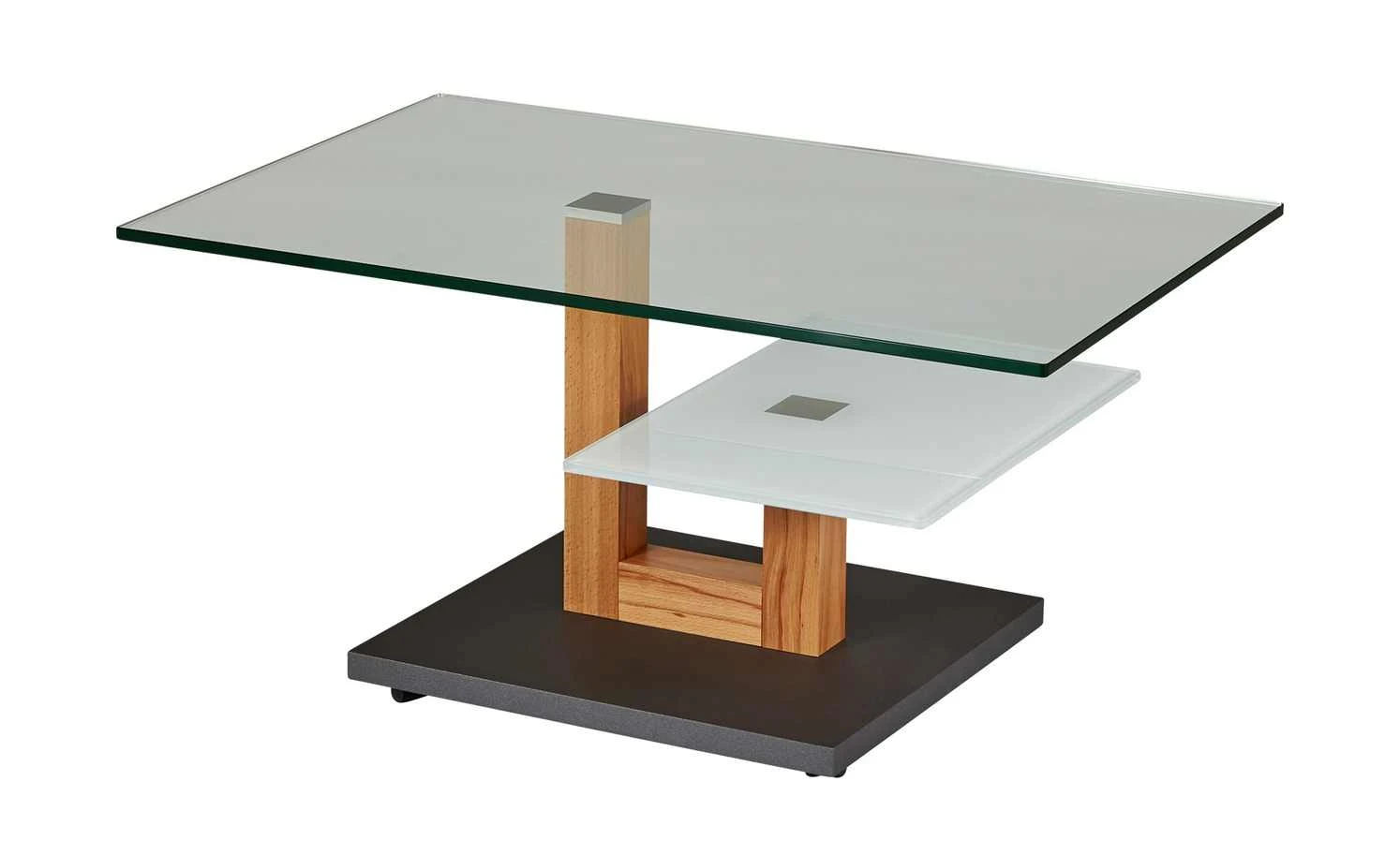 Der Couchtisch Hadar ist nicht nur attraktiv anzuschauen, sondern auch praktisch. Das macht ihn zum Highlight Ihres Wohnzimmers. Der Tisch besteht aus hochwertigen Materialien und ist mit dem Gütesiegel Made in Germany ausgezeichnet. Hadar verfügt über ein zweigeteiltes Säulengestell, dass Tischplatte und Ablage trägt. Die beiden Säulen bestehen aus massiver Kernbuche, sind geölt und setzen sich somit von den Glasplatten ab. Diese bestehen beide aus G. Während die Tischplatte transparent ist, hat die Ablage einen milchigen Opti-White-Ton. Einen dramatischen Kontrast stellt die Bodenplatte dar. Sie ist anthrazitfarben. Praktisch: Hadar ist mit Rollen ausgestattet und kann dadurch flexibel bewegt werden.