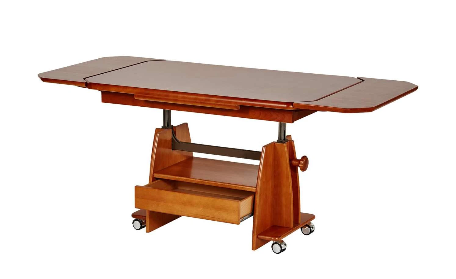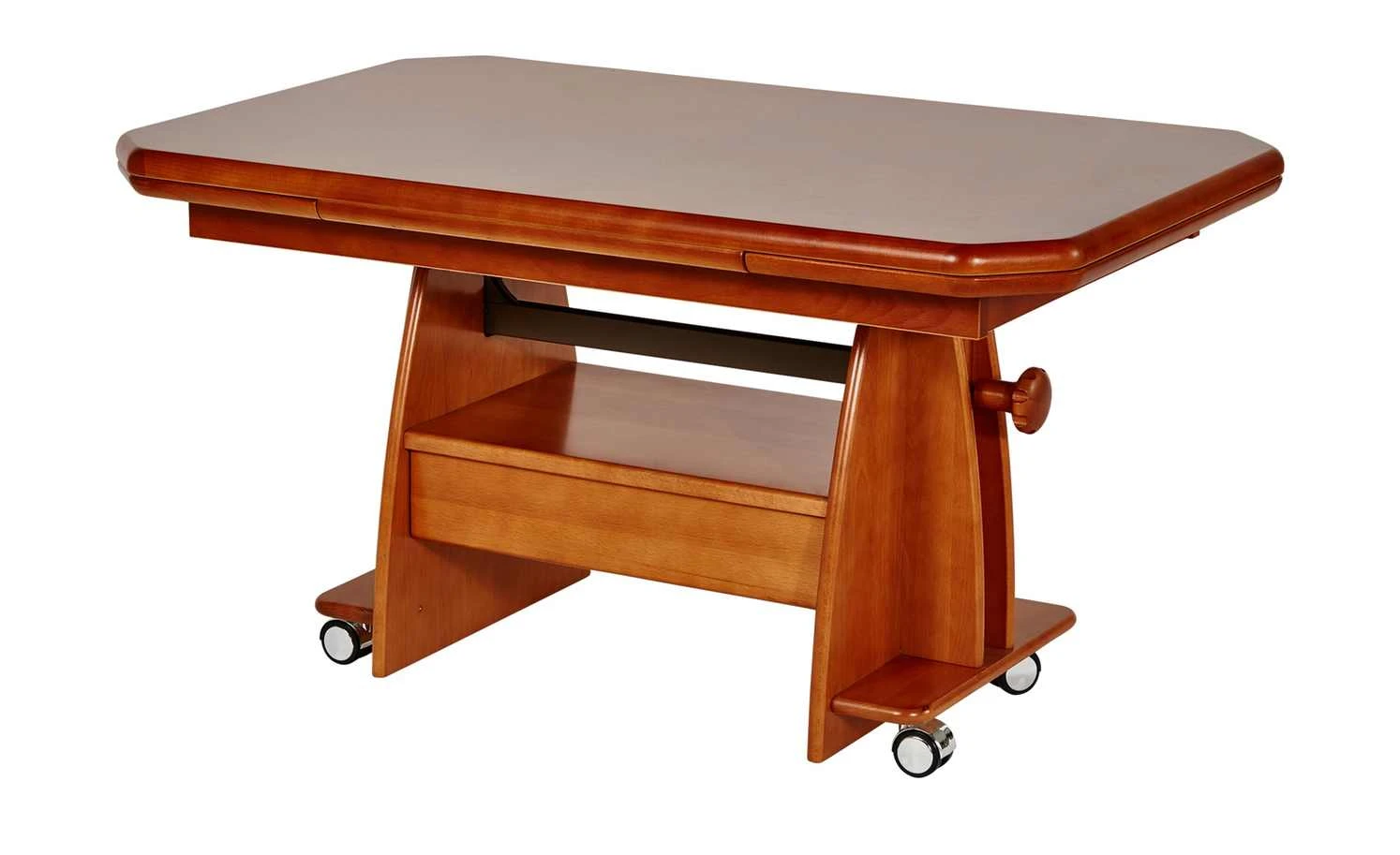 Der Couchtisch Hamal lässt sich auf Ihre Bedürfnisse anpassen. Durch die Rollen können Sie ihn einfach dorthin bewegen, wo Sie ihn brauchen. Die Höhe des Tisches lässt sich von 55 bis 65 Zentimeter variieren. Die Verstellung erfolgt händisch – und zwar mithilfe eines Knopfes unterhalb der Tischplatte. Die Tischplatte selbst kann von 110 auf 160 Zentimeter Länge ausgezogen werden. Hamals besteht aus Buchenholz. Während für die Tischplatte ein Furnier verwendet wurde, besteht das Gestell aus massiver Buche. Das Holz ist gebeizt und lackiert worden, wodurch es eine schöne Kirschbaumoptik erhalten hat.