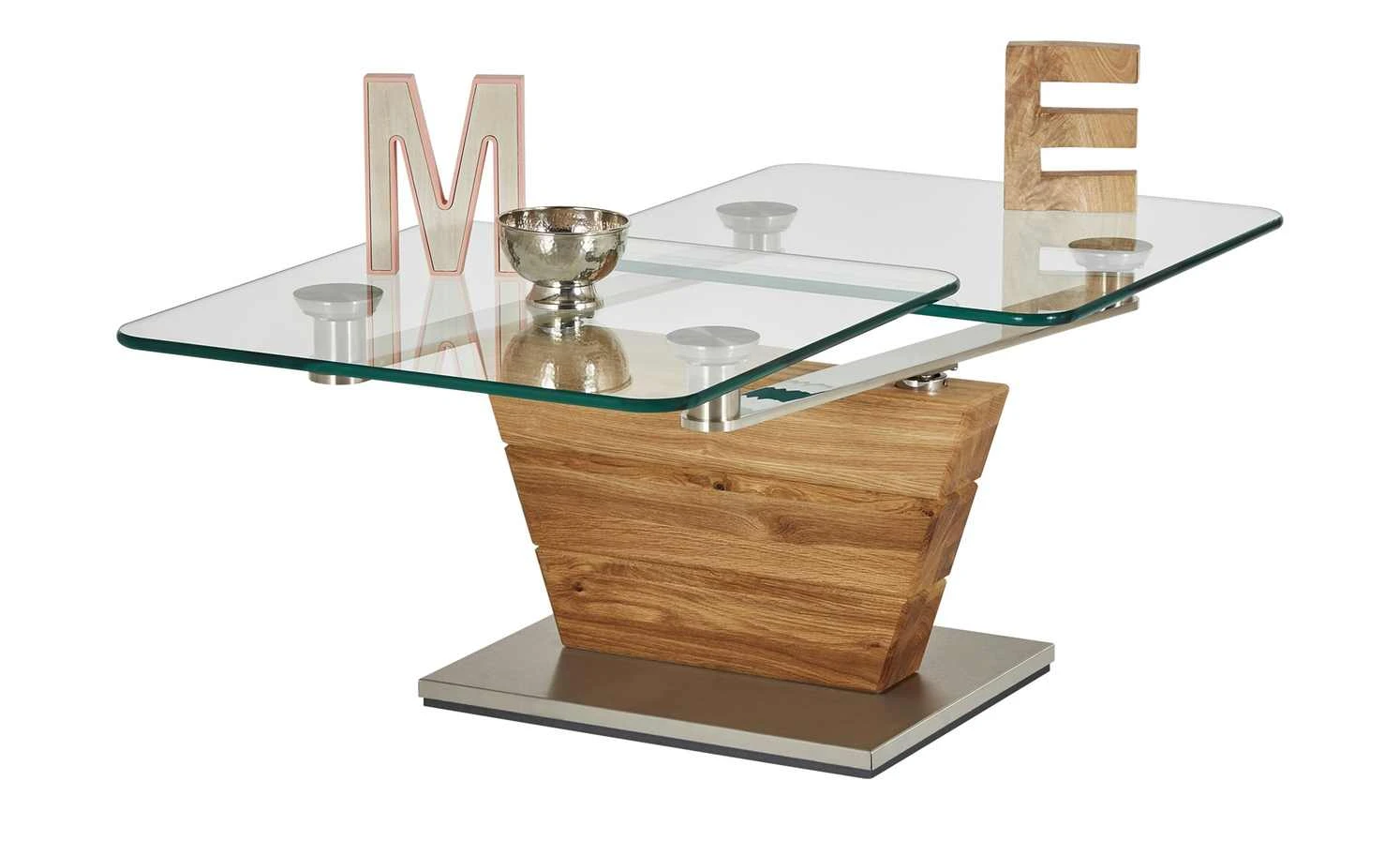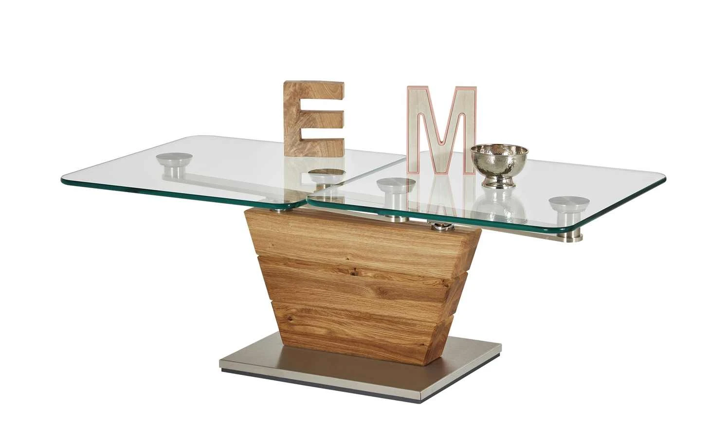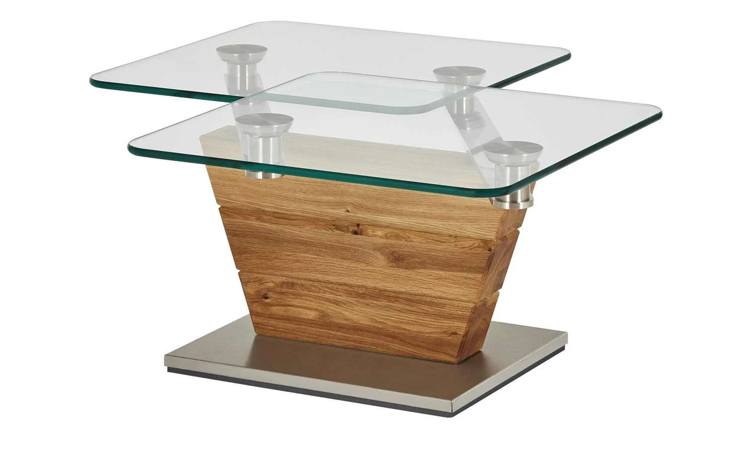 Der Couchtisch Han ist ein optisches und funktionales Highlight für Ihren Wohnraum. Praktisch: Die beiden Tischplatten können Sie je nach Bedarf in die passende Position bewegen. Die integrierte Dreh- und Schwenkmechanik macht es möglich. Sie ist aus hochwertigem Edelstahl gefertigt. Die Tischplatten selbst sind aus Klarglas. Es ist stabil und leicht zu reinigen. Für einen sicheren Stand sorgt das Gestell in Säulenform. Für die Säule ist massive Asteiche verwendet worden. Das Holz ist stabil und langlebig. Gleichzeitig verfügt es über eine rustikale Maserung mit Struktur- und Farbunterschieden. Ein Eyecatcher sind die holztypischen Asteinschlüsse. Sie geben der Asteiche ihren Namen.