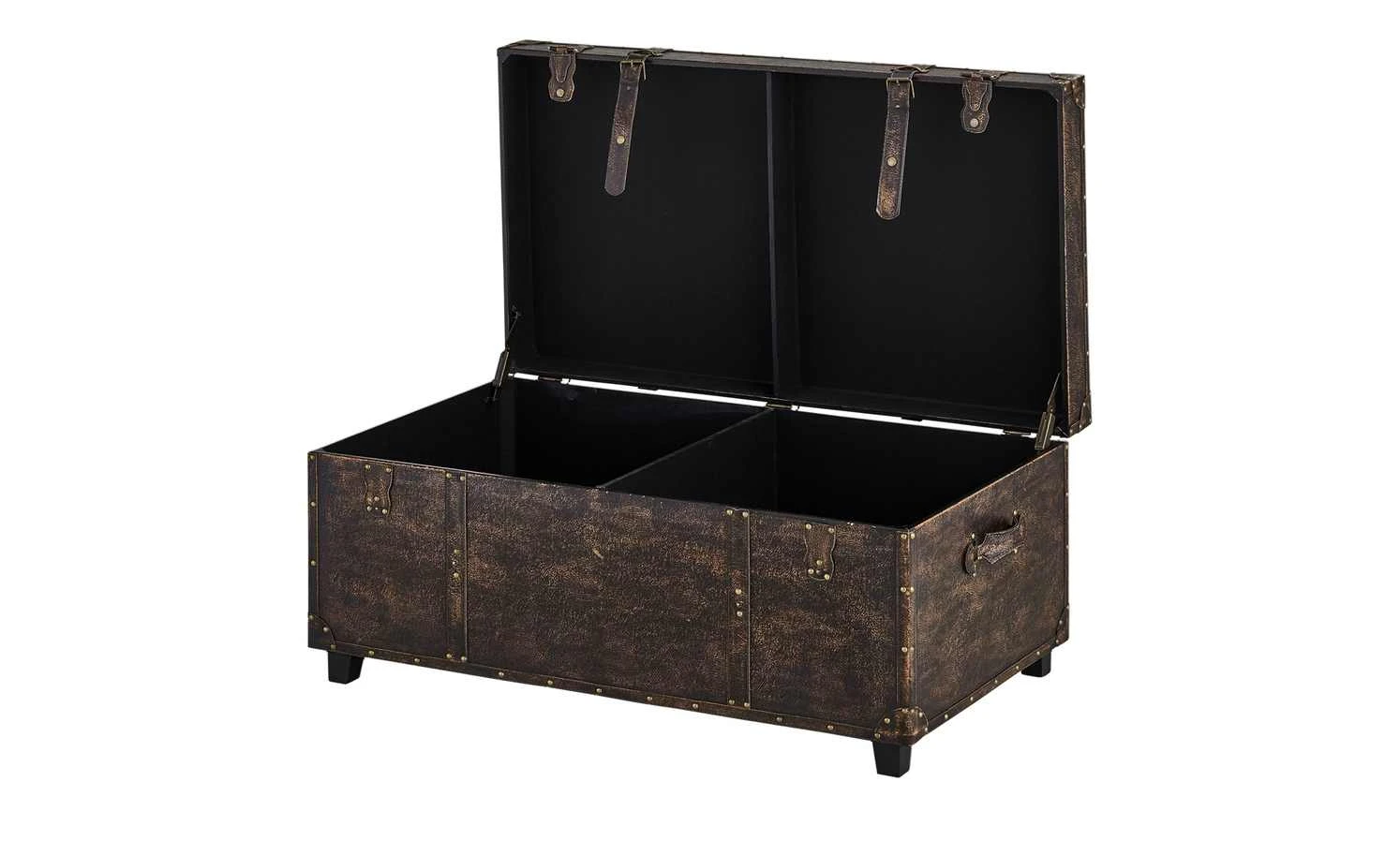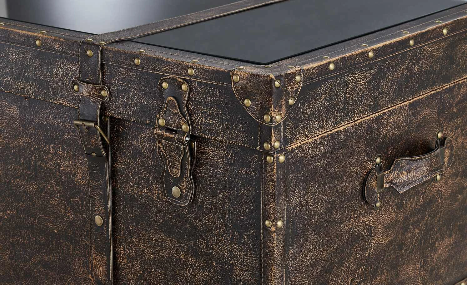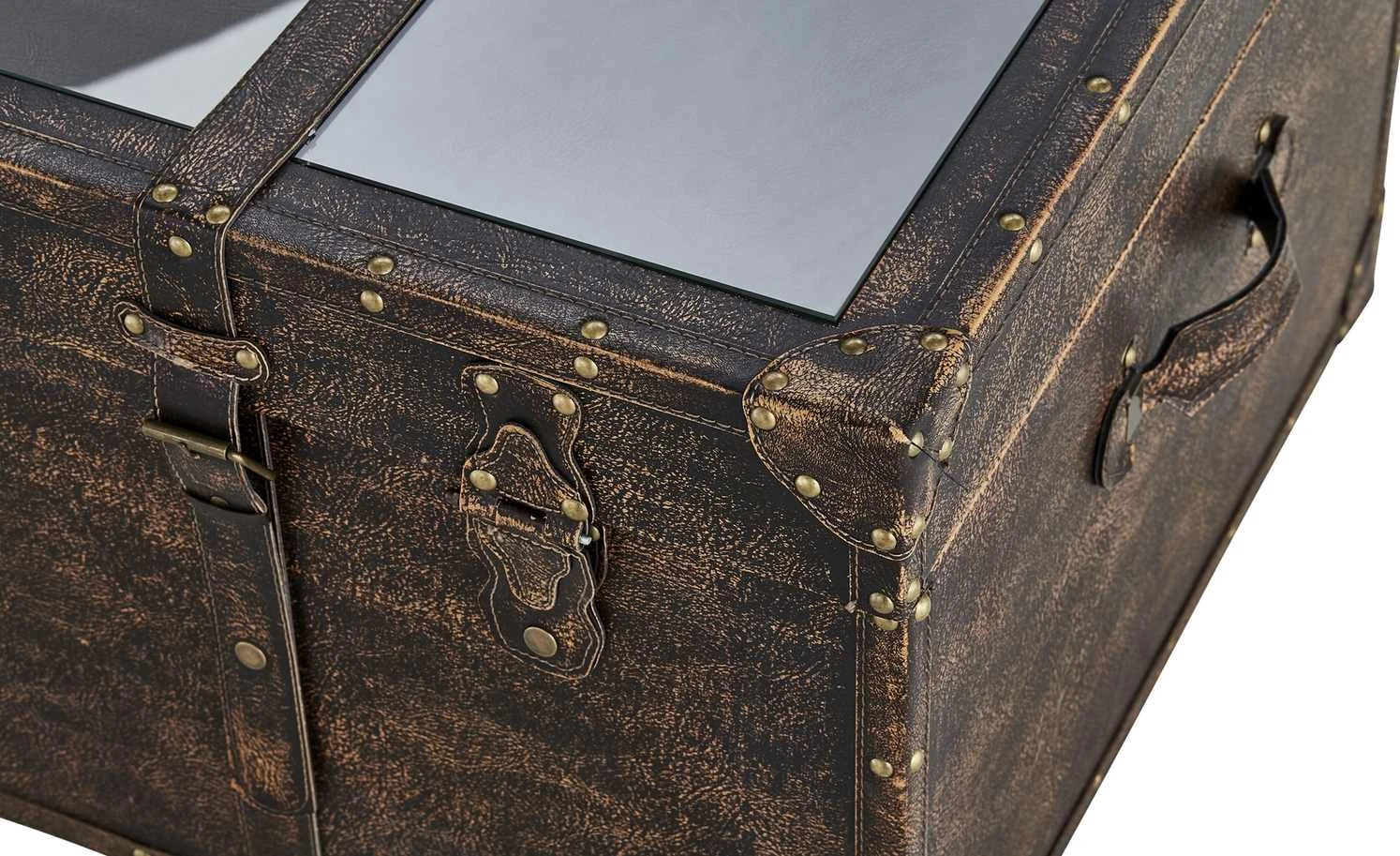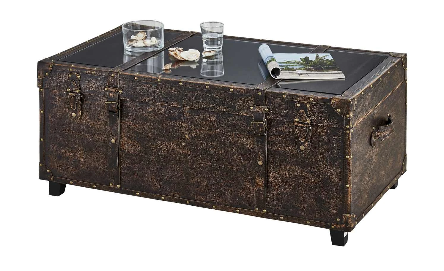 Der Couchtisch Gavi zeigt, dass es Alternativen zum klassischen Couchtisch im Wohnzimmer gibt. Er bietet Platz für Fernweh und jede Menge Kleinigkeiten. Auch im größten Wohnzimmer braucht man viel Stauraum. Zeitschriften, Bücher, Spiele und allerlei Kleinigkeiten sind am besten untergebracht, wenn Sie griffbereit in der Nähe sind. Auch Kissen und Wolldecken finden hier ihren Platz. Der Wohnzimmertisch im Koffer-Design verstaut und versteckt so einiges. Die braune Farbe sowie die aufgesetzten Griffe und Schnallen verleihen dem Couchtisch den angesagten Shabby Chic.