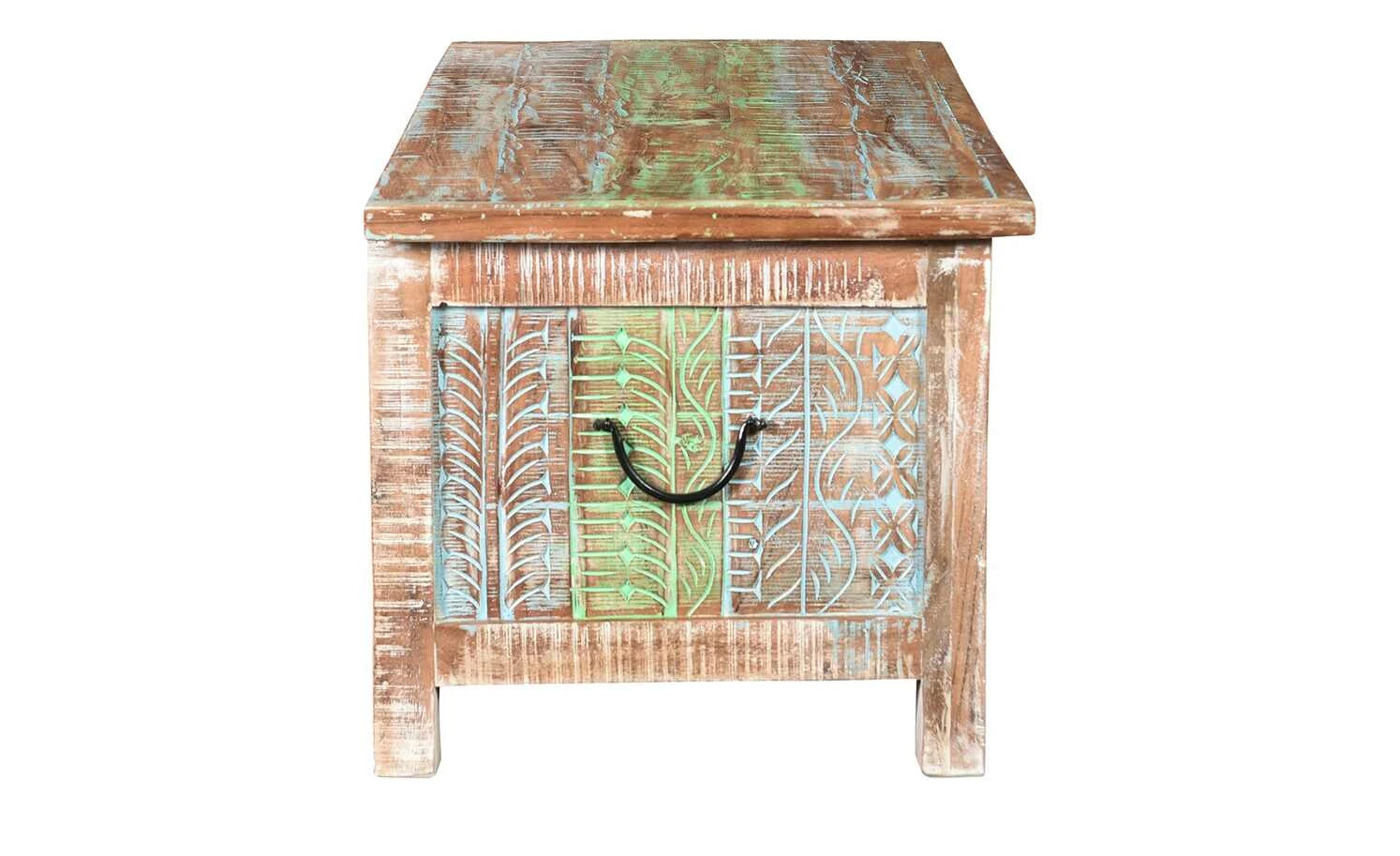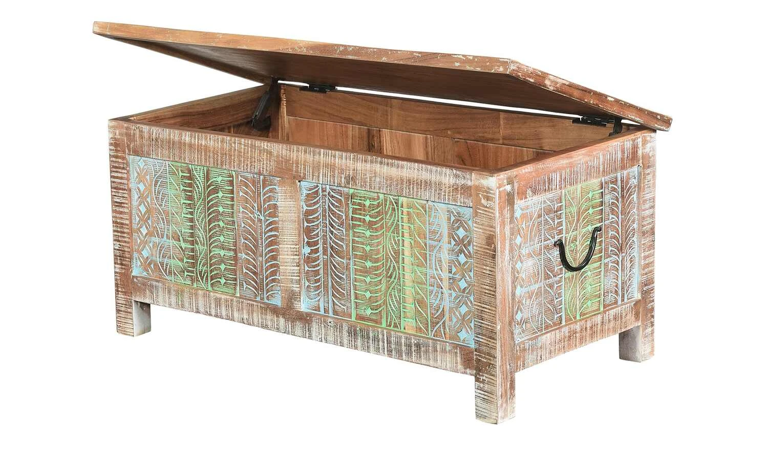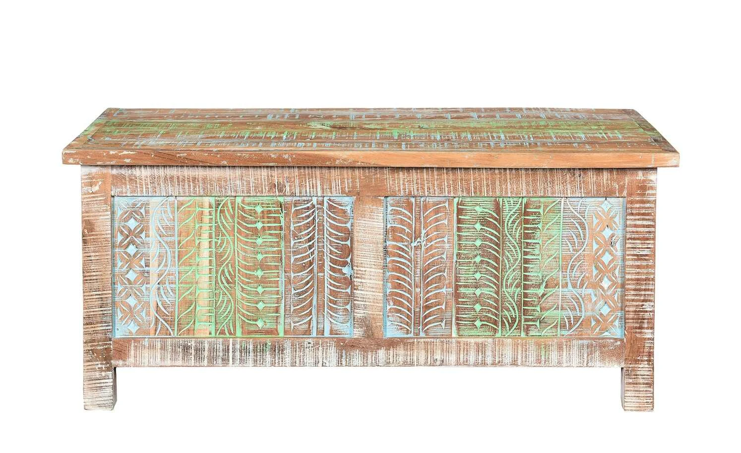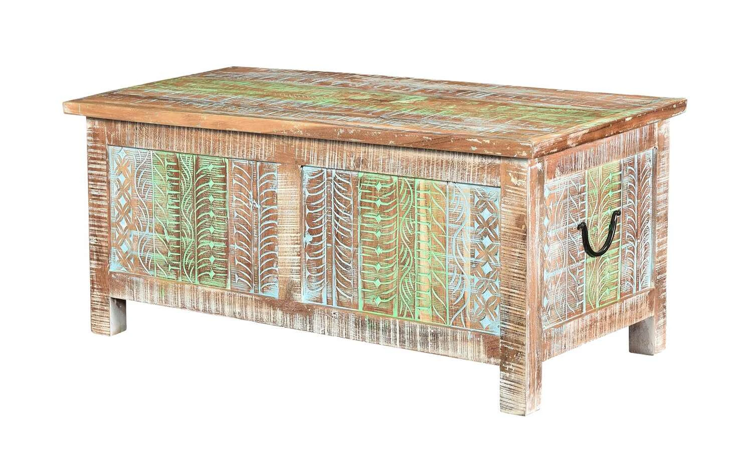 Bei der Serie Laos entsteht durch die Kombination aus massivem Mangoholz und blau-grünen Akzenten ein außergewöhnliches, exotisches Design. Das Massivholz wurde gebürstet und lackiert. Liebevoll gearbeitete Schnitzereien und attraktive, schwarze Metallgriffe komplettieren das Design. Dieser Couchtisch der Serie erinnert an eine Truhe. Unter der 100 x 50 Zentimeter großen Tischplatte befindet sich praktischer, blickdichter Stauraum für Sitzkissen und Co. Kombinieren Sie den Couchtisch mit maritimen oder orientalischen Bodenkissen, um eine gemütliche Sitzgruppe zu erschaffen.