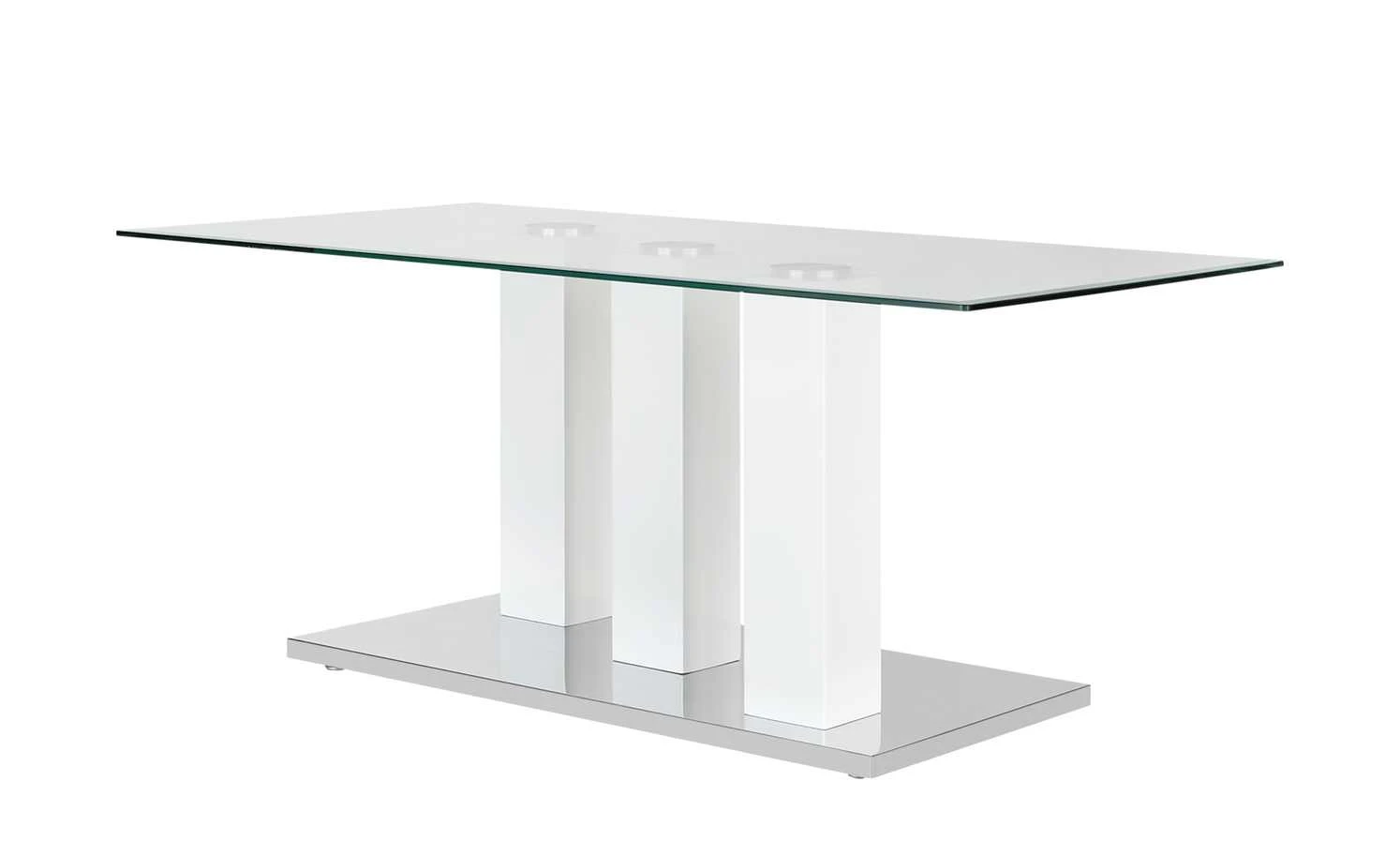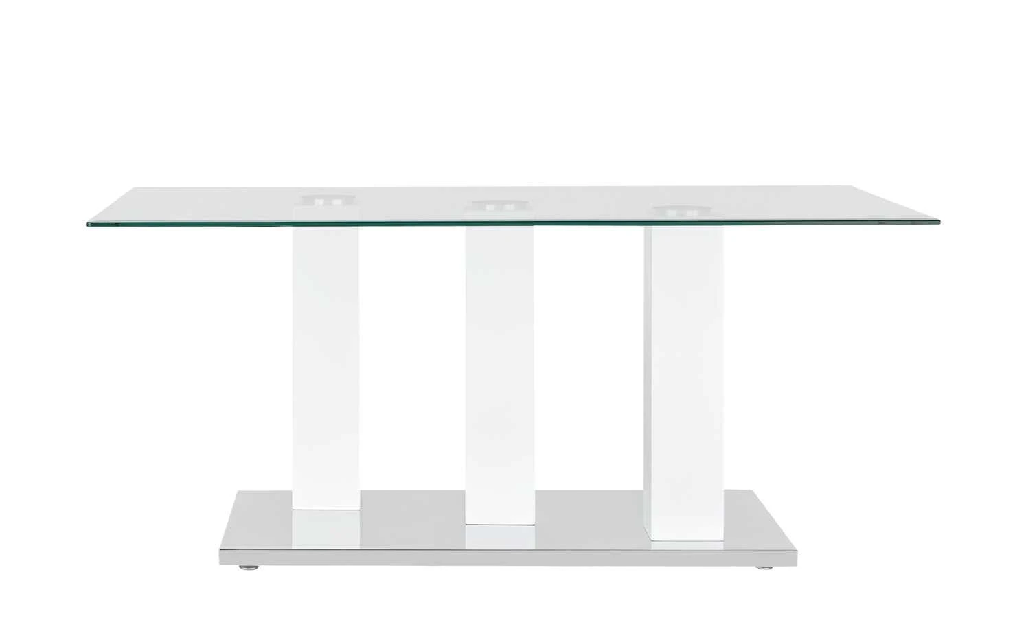 Der Couchtisch Malden hat ein modernes Design und ist stabil gearbeitet. Die Tischplatte besteht aus Klarglas. Es ist strapazierfähig und ist leicht zu reinigen. Für einen soliden Stand sorgt das Gestell, das aus drei Säulen besteht. Alle drei sind hochwertig lackiert und haben ein schönes Hochglanzfinish. Die Bodenplatte setzt sich in Silberoptik ab.