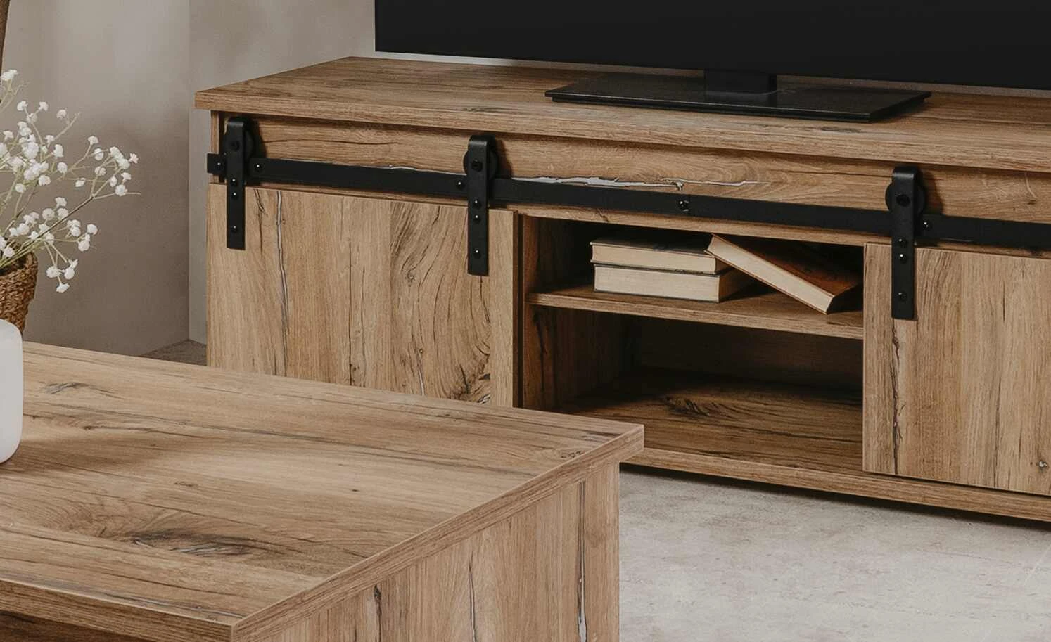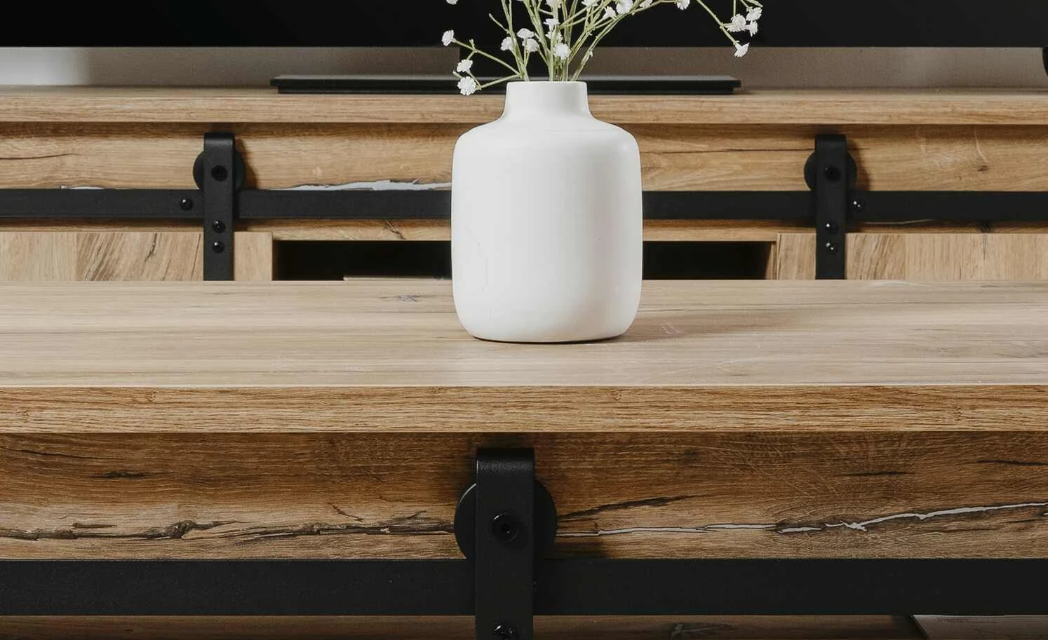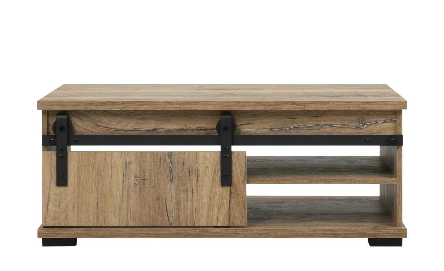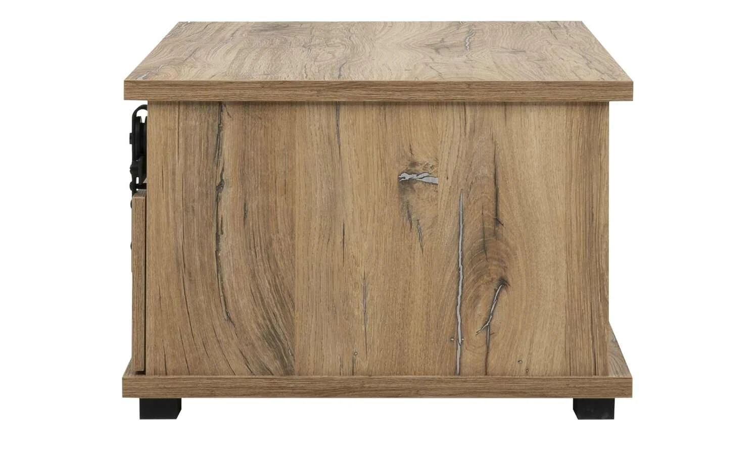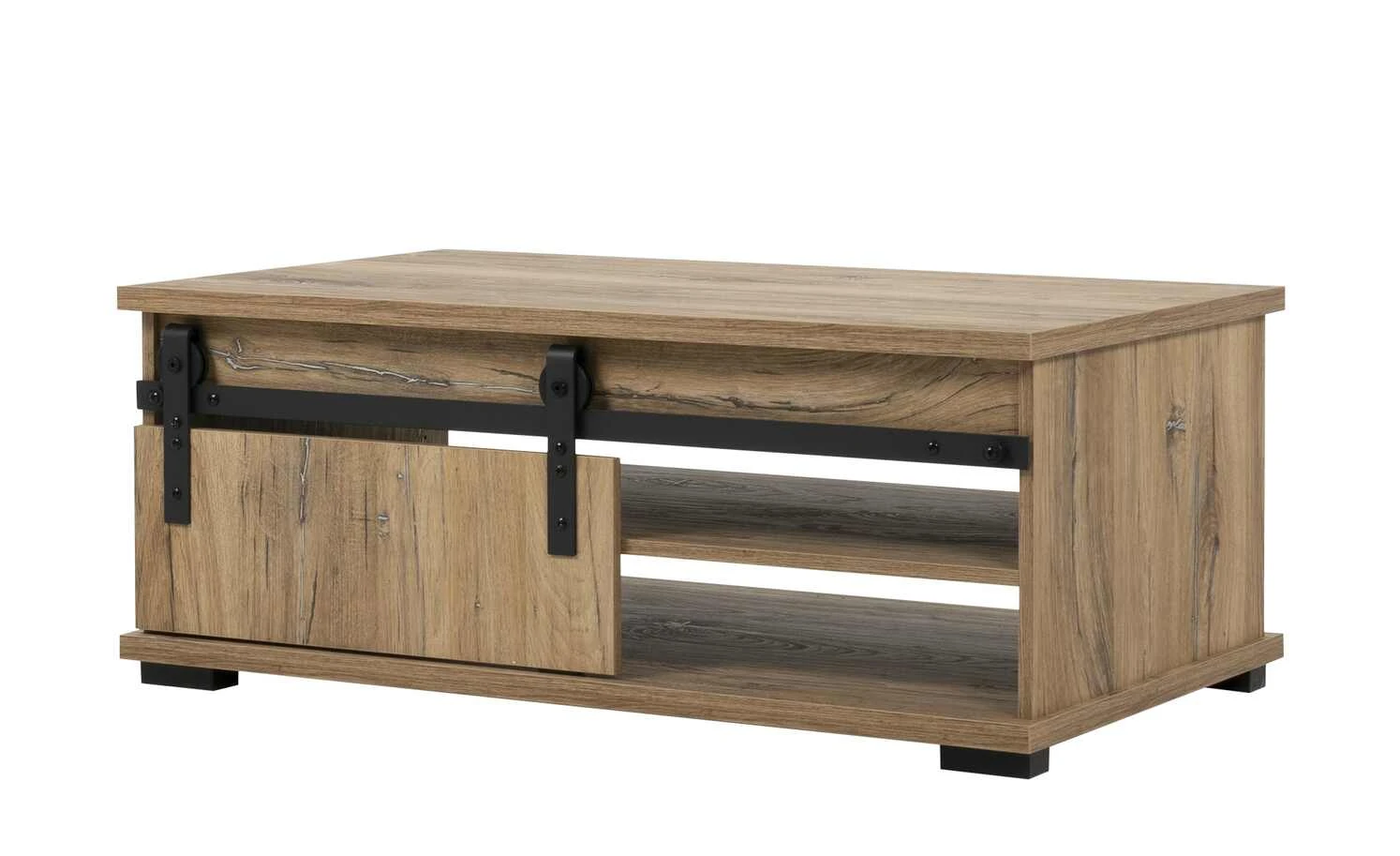Der Couchtisch Mangano bringt attraktives Industrial-Ambiente zu Ihnen. Die dunklen, pflegeleichten Oberflächen in Eiche Antik (Nachbildung) werden mit schwarzem Metall kombiniert. Unter der 60 x 100 Zentimeter großen Tischplatte befinden sich zwei praktische Ablagemöglichkeiten für Zeitschriften, Fernbedienungen und Co. Verschieben Sie die bewegliche Türfront ganz nach Ihren Wünschen, um einen partiell blickdichten Bereich unter dem Couchtisch zu schaffen.