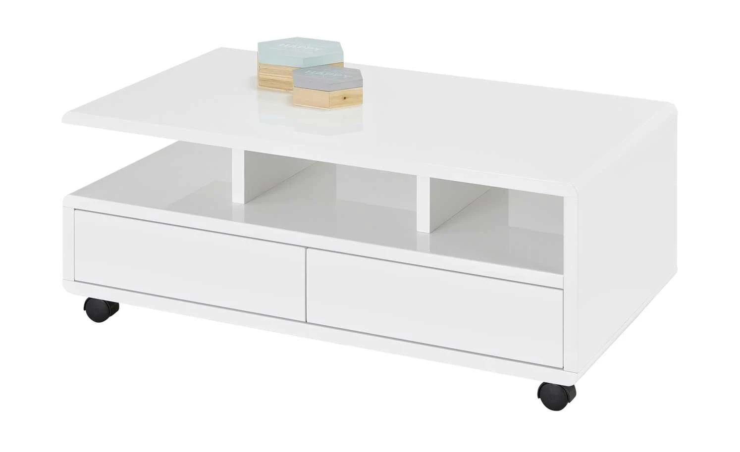 Stauraum, Tisch und flexibel beweglich – das ist der Couchtisch Maui. Unterhalb der rechteckigen Tischplatte gibt es drei offene Fächer. Weiterer Stauraum befindet sich in den beiden großen Schubladen. Sie öffnen durch die Push-to-Open-Funktion. Statt fester Füße ist der Tisch mit vier Rollen ausgestattet. Sie ermöglichen es Ihnen, den Tisch leicht zu bewegen. Das moderne Design und der lackierte Weißton machen Maui auch optisch zum Highlight.