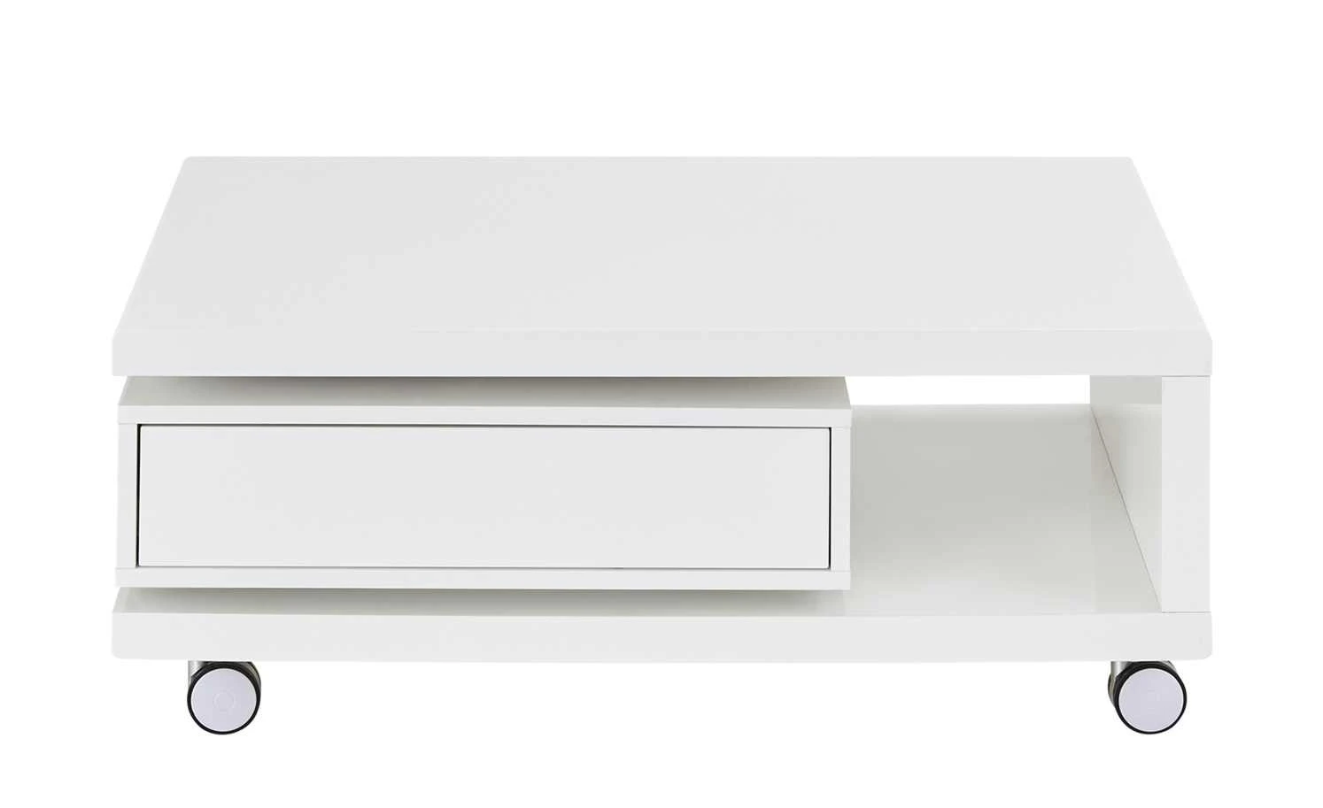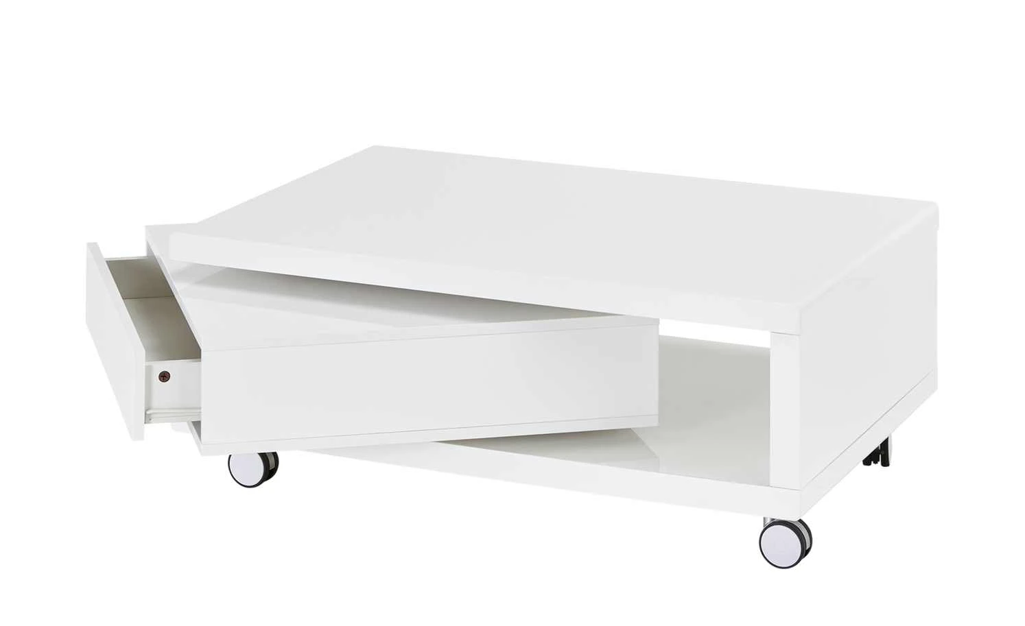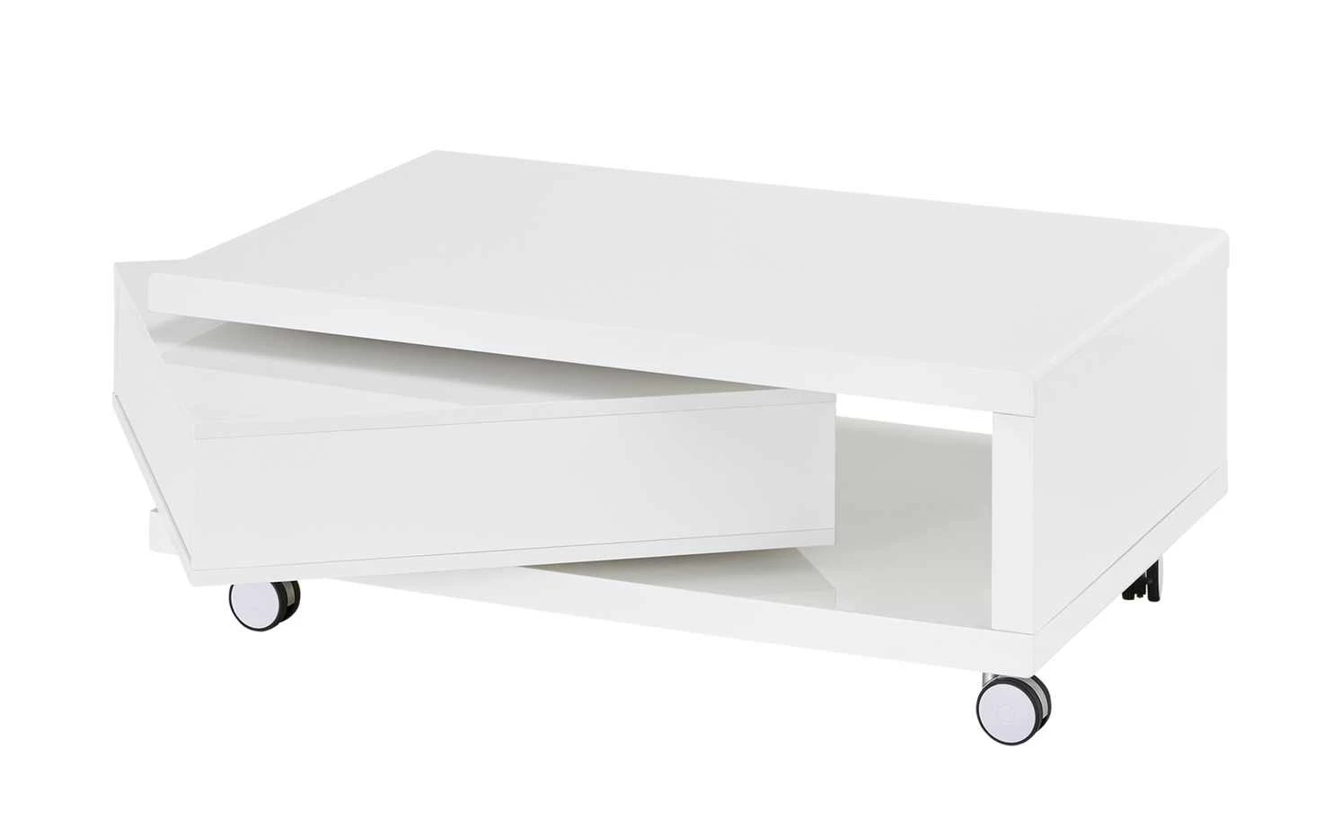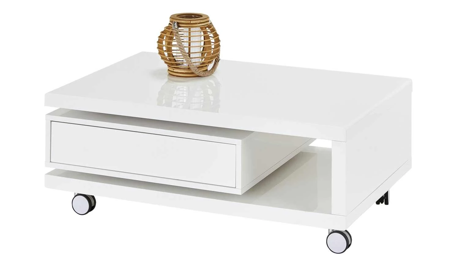 Cooles Design in Weiß und seine funktionale Ausstattung machen den Couchtisch Menorca zum Highlight. Der gesamte Tisch ist lackiert und hat ein modernes hochglänzendes Finish. Unterhalb der rechteckigen Tischplatte befindet sich ein Schubkastenelement, das sich drehen lässt. So erhalten Sie eine zusätzliche Ablagefläche. Der Schubkasten selbst ist mit einer Push-to-Open-Funktion ausgestattet und öffnet durch einen leichten Druck auf die Front. Neben dem Element befindet sich ein offenes Fach, das Sie vielseitig befüllen können. Menorca ist mit vier Rollen ausgestattet, damit Sie ihn leicht bewegen können.