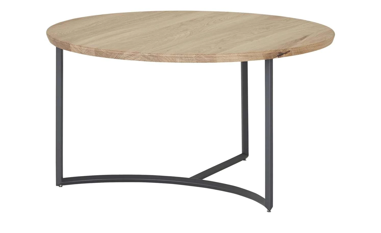 Der Couchtisch Moon ist ein cooles It-Piece für Ihr Wohnzimmer. Die runde Tischplatte aus massiver Asteiche wird von einem Designgestell aus Metall getragen. Dabei treffen sich die drei Tischbeine in der Mitte und ergeben zwei Kufen. Eine der beiden ist halbrund designt und erinnert an die Sichel des Mondes. Die basaltgraue Lackoberfläche setzt sich dekorativ von der Asteiche der Tischplatte ab.