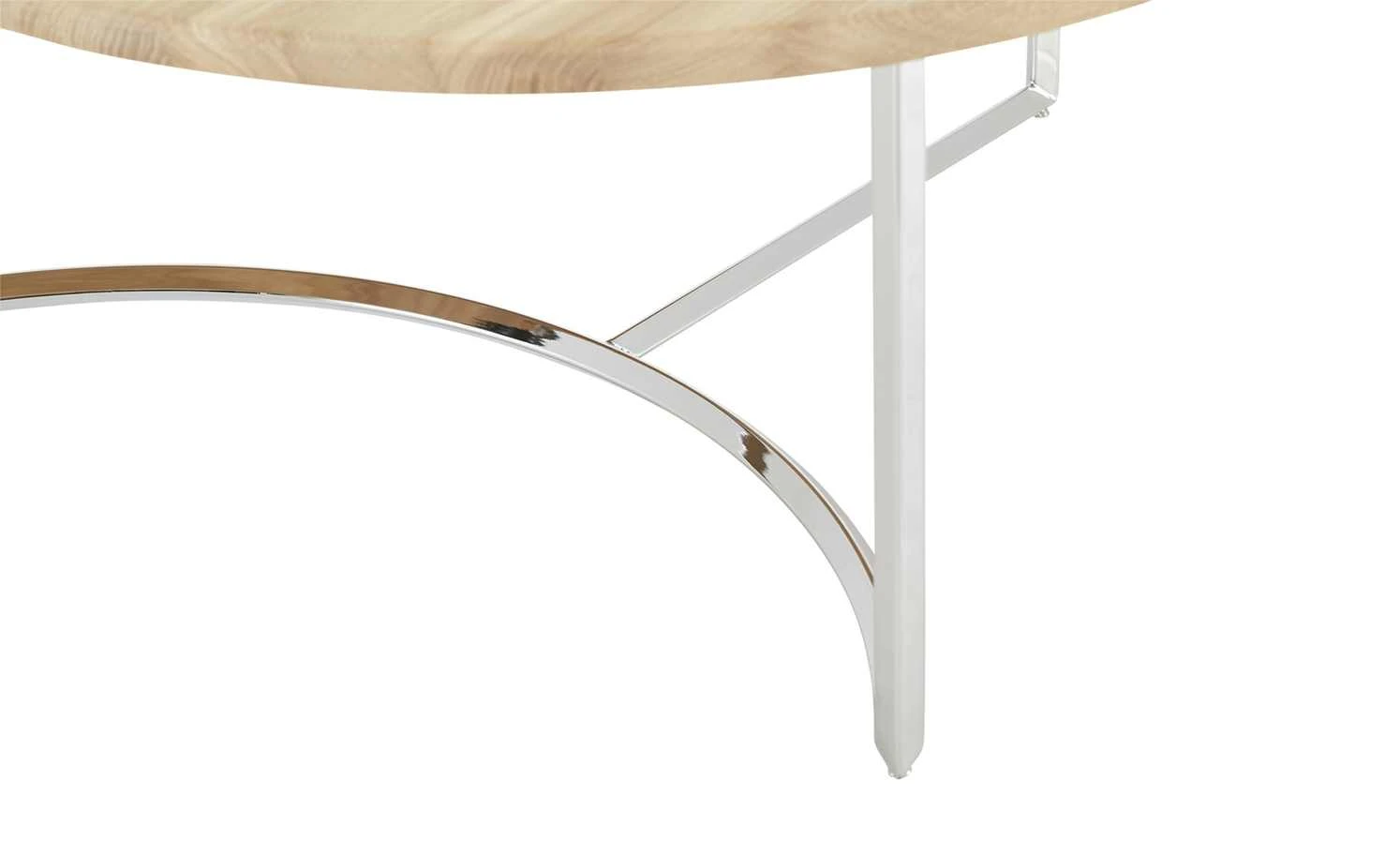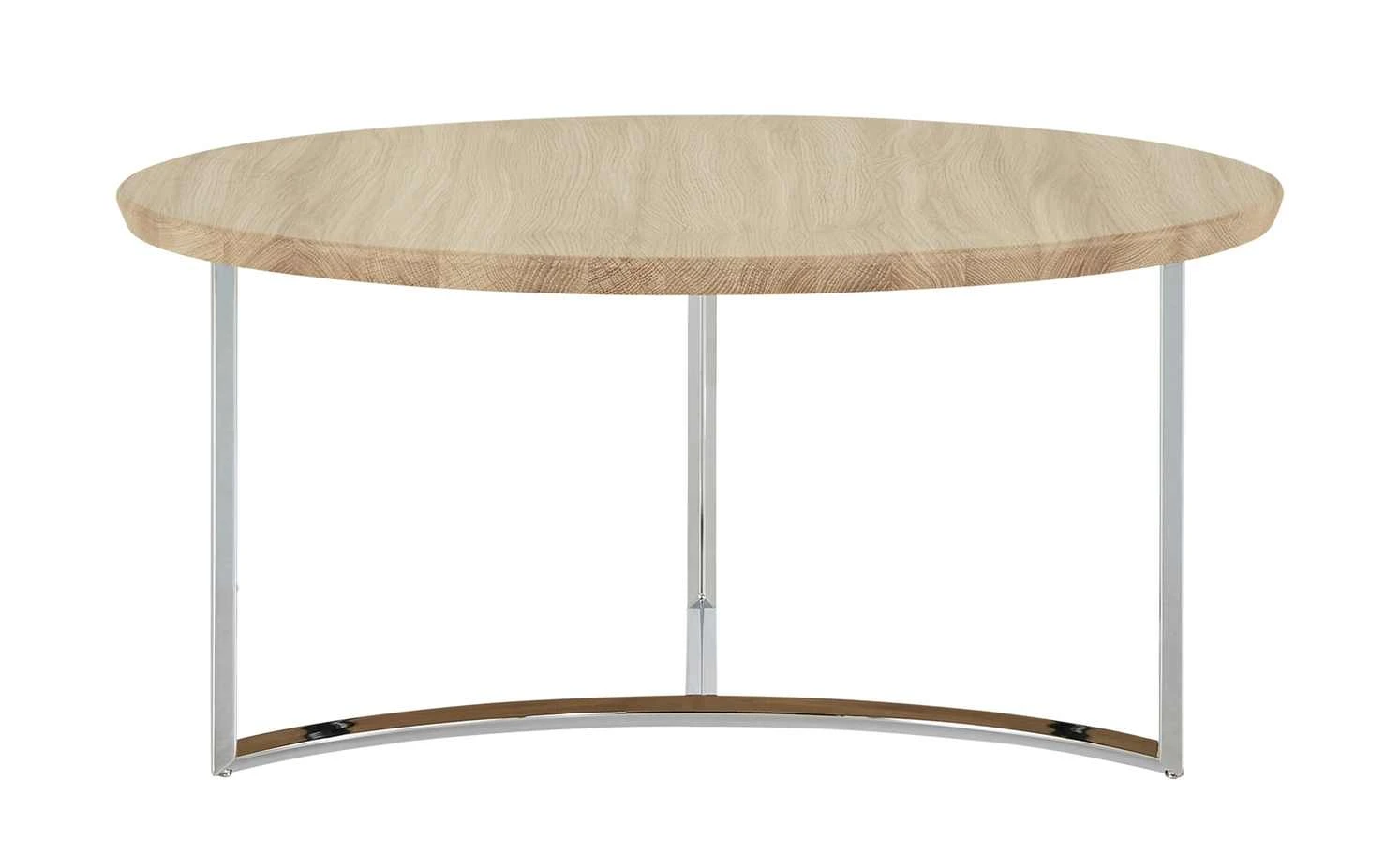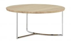 Der Couchtisch Moon ist ein cooles It-Piece für Ihr Wohnzimmer. Die runde Tischplatte aus massiver Asteiche wird von einem Designgestell aus Metall getragen. Dabei treffen sich die drei Tischbeine in der Mitte und ergeben zwei Kufen. Eine der beiden ist halbrund designt und erinnert an die Sichel des Mondes. Die verchromte Oberfläche ist hochglänzend und setzt sich dekorativ von der Asteiche der Tischplatte ab.