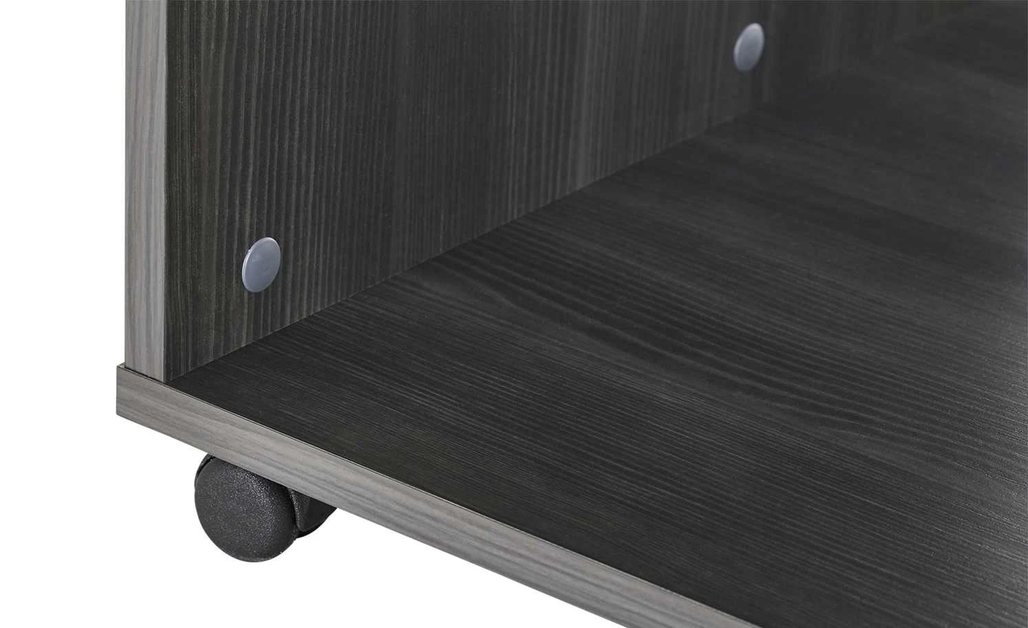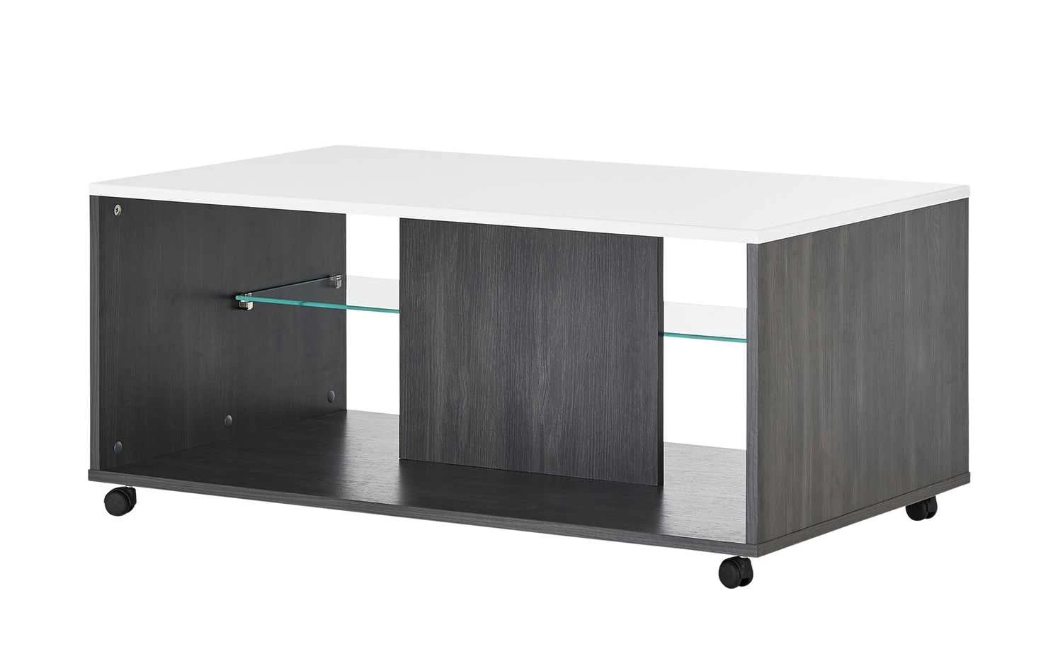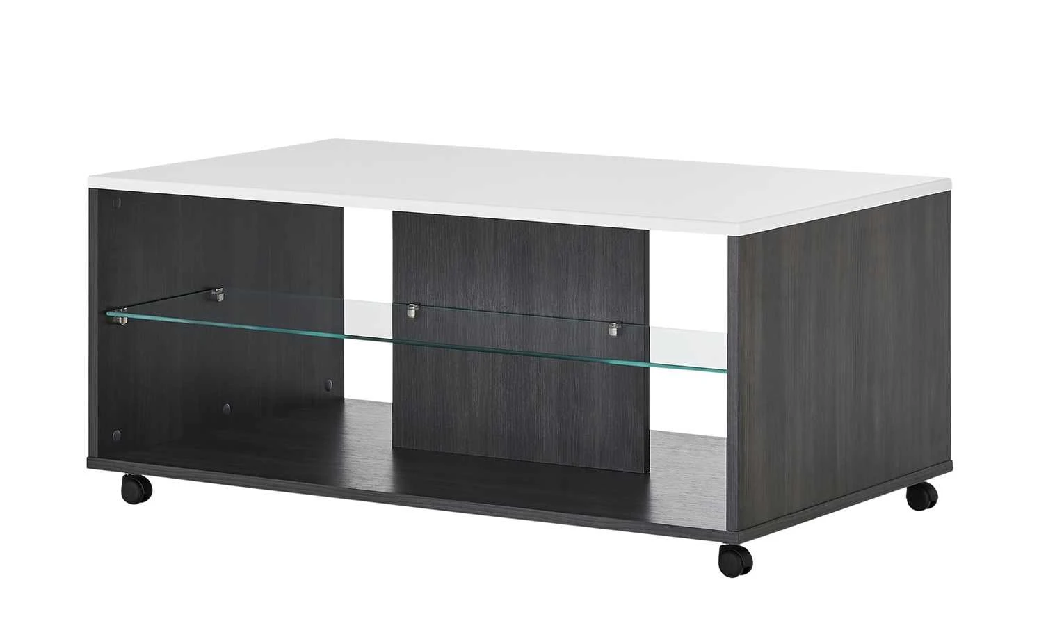 Der Couchtisch Palmarola punktet mit seiner Beweglichkeit. Er ist mit vier Rollen ausgestattet und kann deshalb leicht an den gewünschten Ort bewegt werden. Neben der Tischplatte verfügt er zwei große Fächer, die von einem Ablageboden aus Klarglas unterteilt werden. Palmarola hat eine zeitlose, gut kombinierbare Holzoptik in Eiche Schwarzbraun (Nachbildung). Die Tischplatte setzt sich in hochglänzendem Weiß ab.