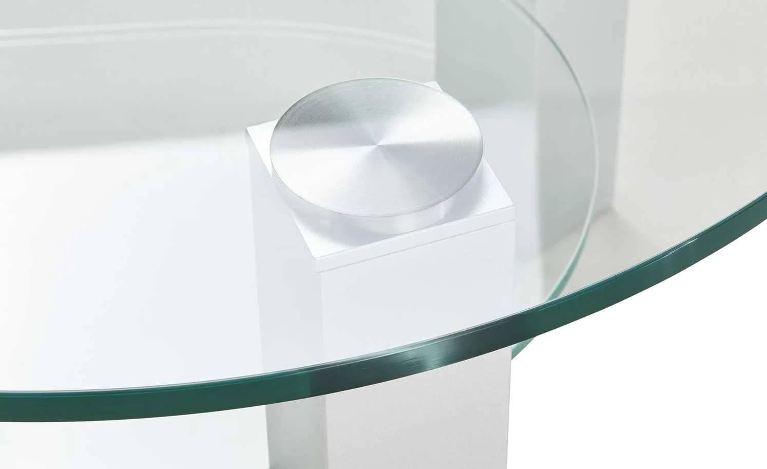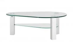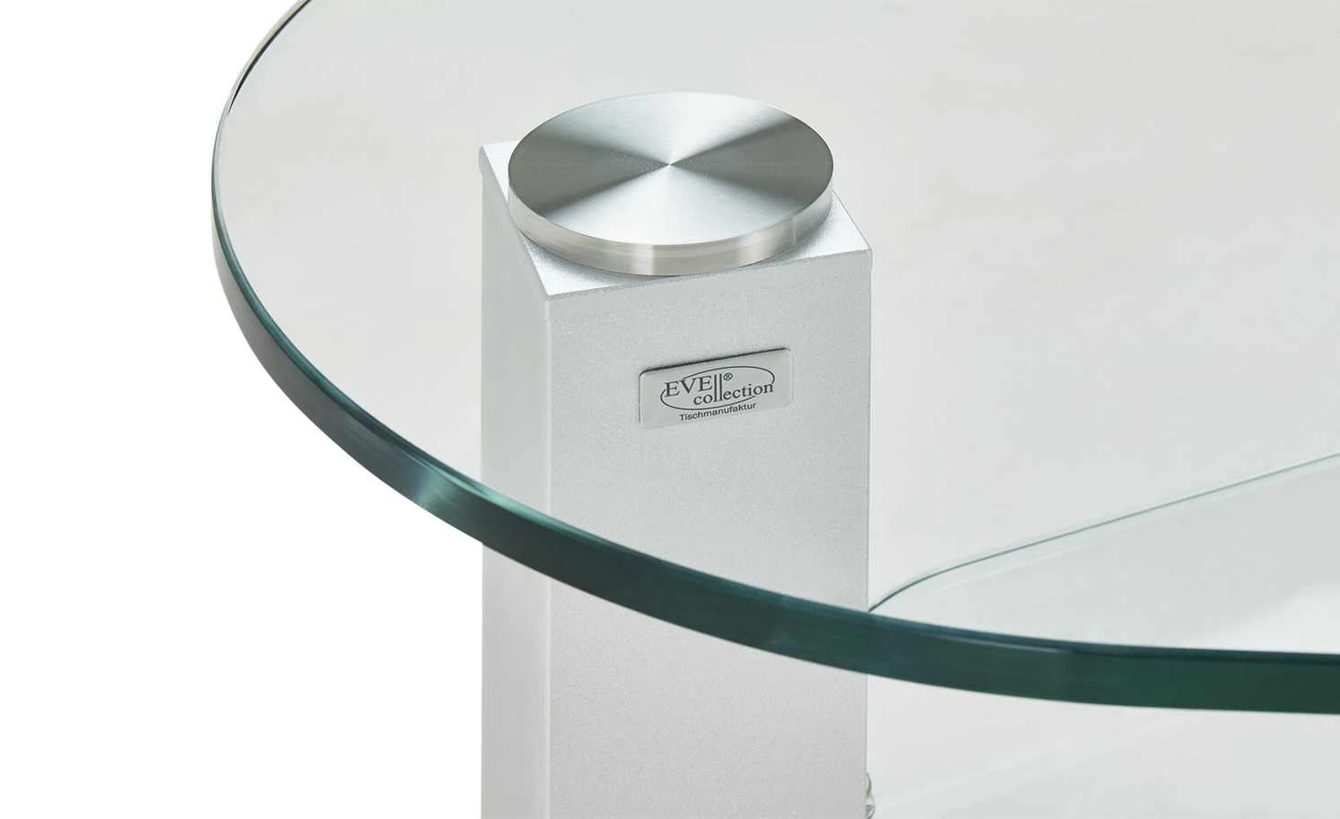 Rimini ist ein dekorativer Couchtisch. Tischplatte und Ablage sind aus Klarglas gefertigt – und haben eine interessante Tropfenform. Das Glas ist nicht nur besonders robust, sondern auch pflegeleicht. Drei Tischbeine sorgen für einen soliden Stand. Sie sind aus Metall gefertigt und sind titansilberfarbig lackiert. Hinzu kommen runde titansilberfarbige Applikationen. Rimini hat eine hochwertige Qualität und ist mit dem Gütesiegel Made in Germany ausgezeichnet.