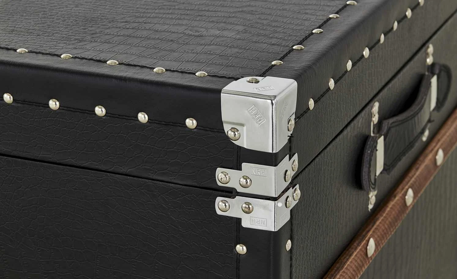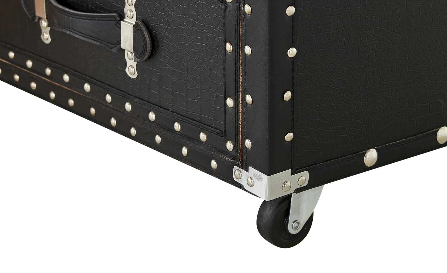 Truhe oder Couchtisch? Teramo ist beides. Der bewegliche Couchtisch im Truhendesign sieht nicht nur klasse aus, sondern bietet auch praktischen Stauraum. Teramo ist mit schwarzem Kunstleder in Kroko-Optik bezogen. Akzente aus dunkler Kiefer und helle Metallnieten verleihen ihm das gewisse Etwas. Ziehen Sie die Tischplatte auseinander: Hier finden Sie ein herausnehmbares Tablett und ein integriertes Flaschenregal mit Platz für zehn edle Tropfen. Im unteren Bereich des Couchtisches gibt es zwei Schubkästen je Seite. Verstauen Sie hier zum Beispiel Magazine und Fernsehzubehör. Dank der leichtgängigen Rollen können Sie den Truhentisch problemlos bewegen.