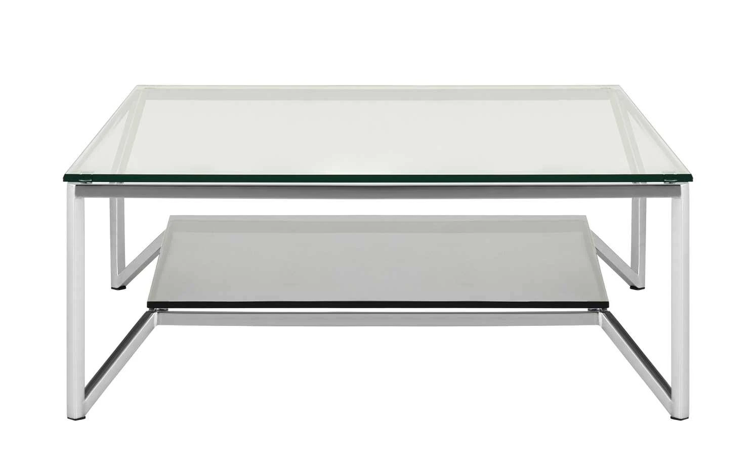 Der auffällig designte Couchtisch Toralf besteht aus einem modernen Materialmix. Die Tischplatte und Ablage sind quadratisch und aus stabilem Glas. Die Tischplatte ist klar, die Ablage hingegen grau, allerdings trotzdem transparent. Das polierte Metallgestell setzt glänzende Akzente. Es fällt durch sein besonderes Design ins Auge.