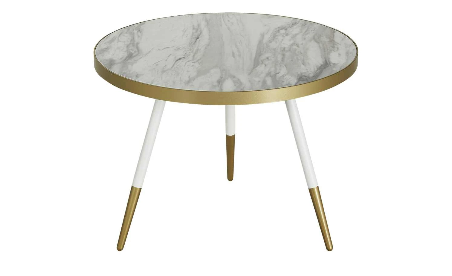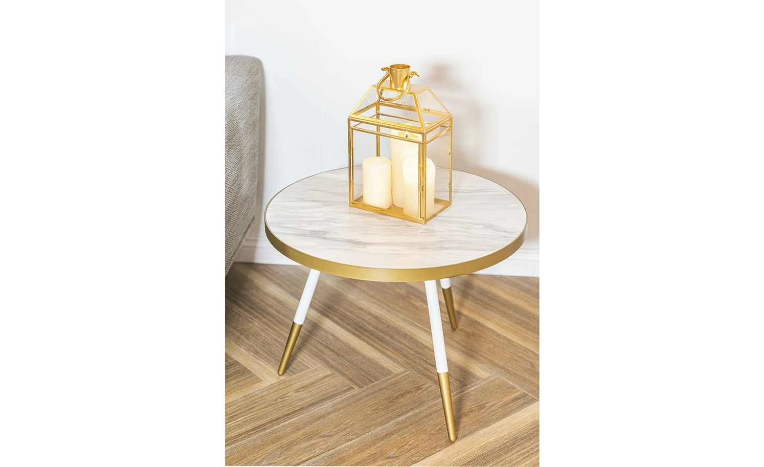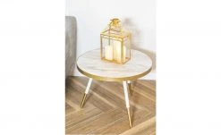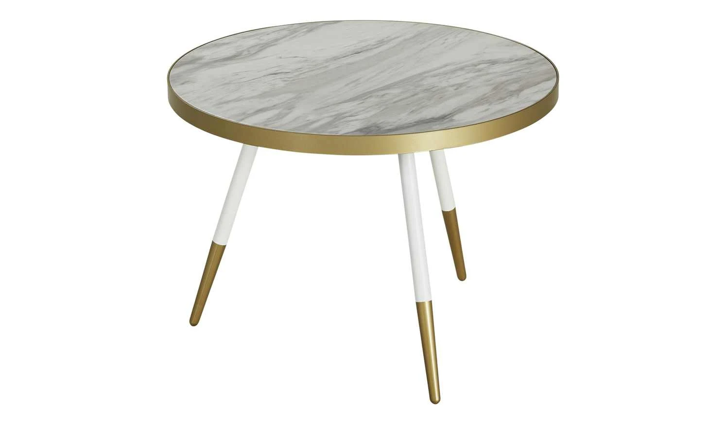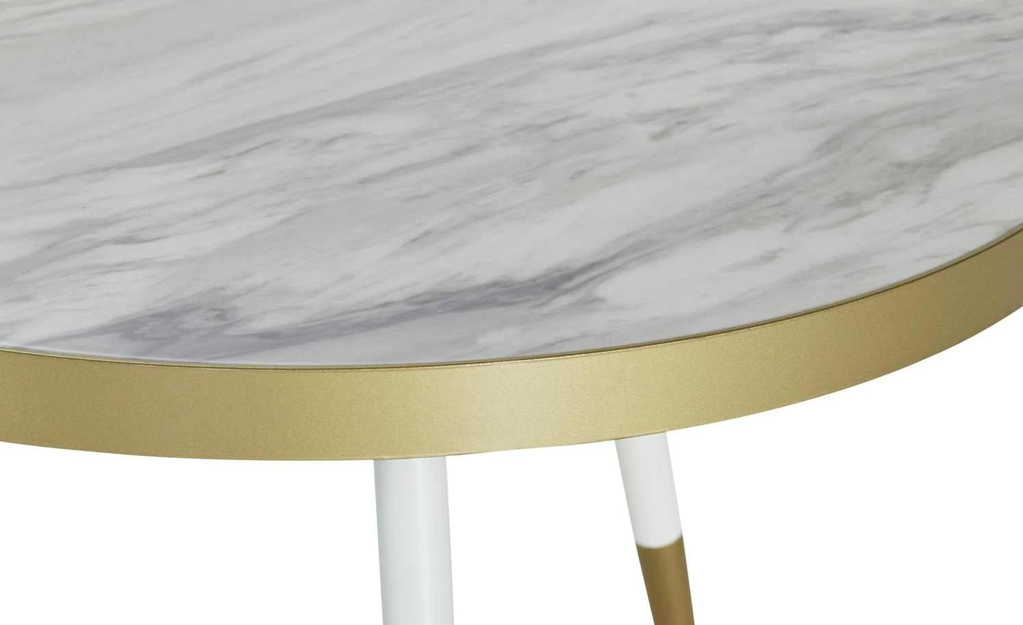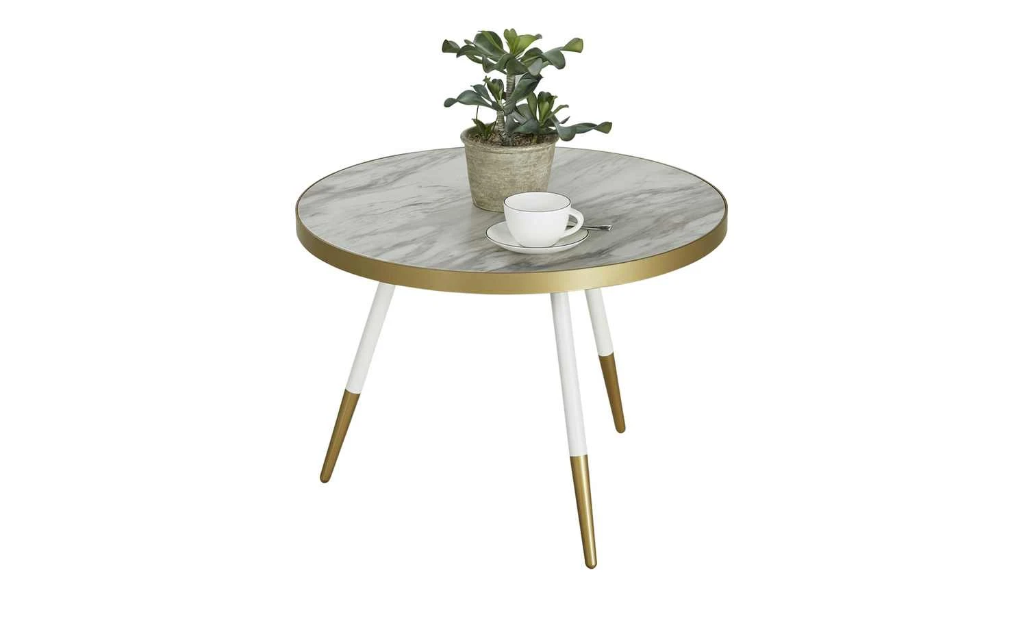 Marmor liegt wieder voll im Trend. Und wie klasse das Material wirkt, beweist auch der Couchtisch Ustica. Er hat eine ausgeprägt marmorierte runde Tischplatte in Marmor Weiß (Nachbildung). Sie wird von einem Rand in Goldoptik abgesetzt. Dieses Finish wiederholt sich an den weißen Tischbeinen. Sie sind am unteren Ende ebenfalls in Goldoptik abgesetzt. Alles zusammen ergibt einen tollen glamourösen Look.