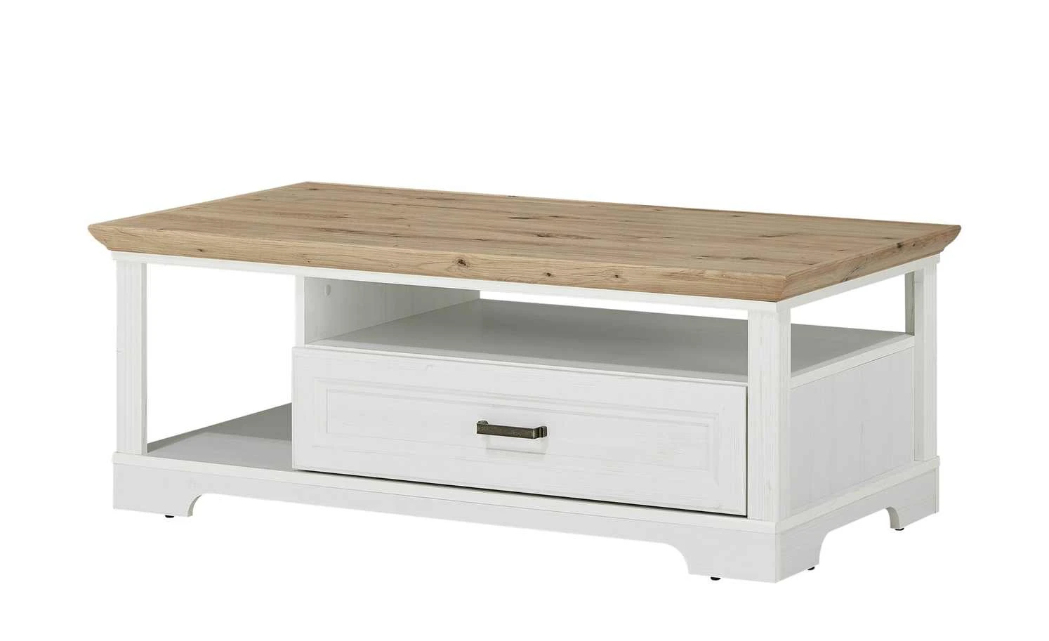 Der Couchtisch Varese zaubert Landhauscharme vor das Sofa. Er passt zu gleichnamigen Serie, kann aber auch mit anderen Möbeln kombiniert werden. Die Tischplatte hat ein rustikales Dekor in Asteiche (Nachbildung) und setzt sich damit vom Gestell in Pinie hell (Nachbildung)ab. Varese verfügt unterhalb der Tischplatte über zwei Fächer und eine geräumige Schublade. Letztere schließt dank der Soft-Close-Ausstattung leise und ist mit einem Selbsteinzug ausgestattet.