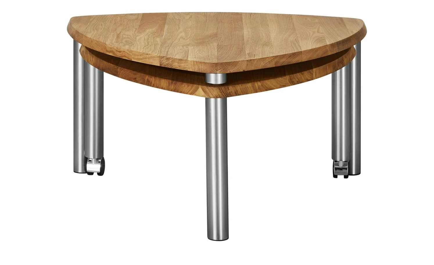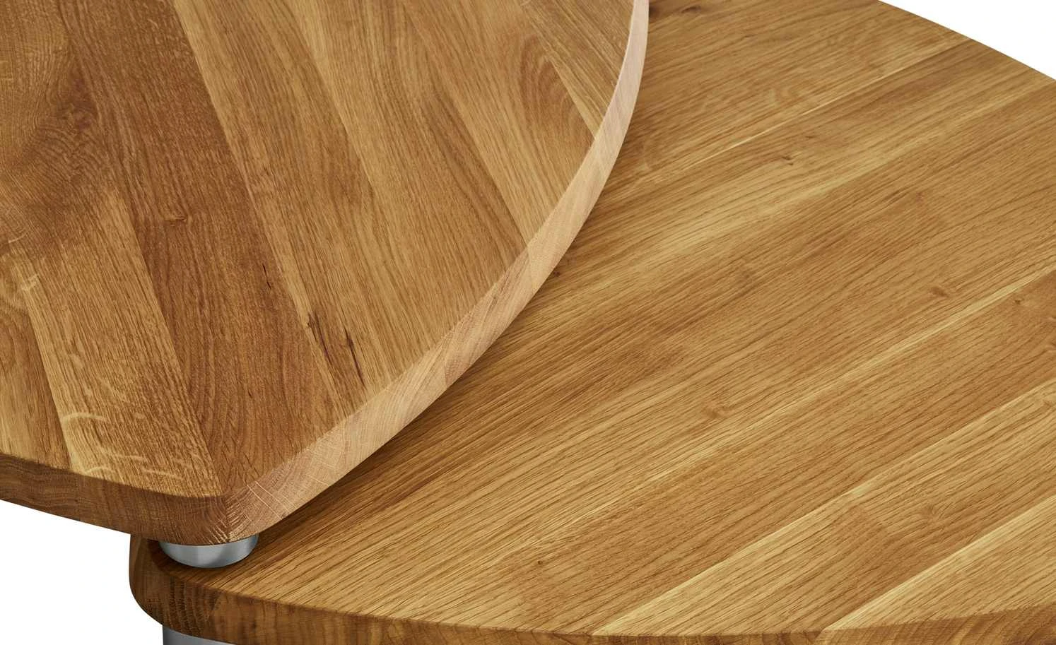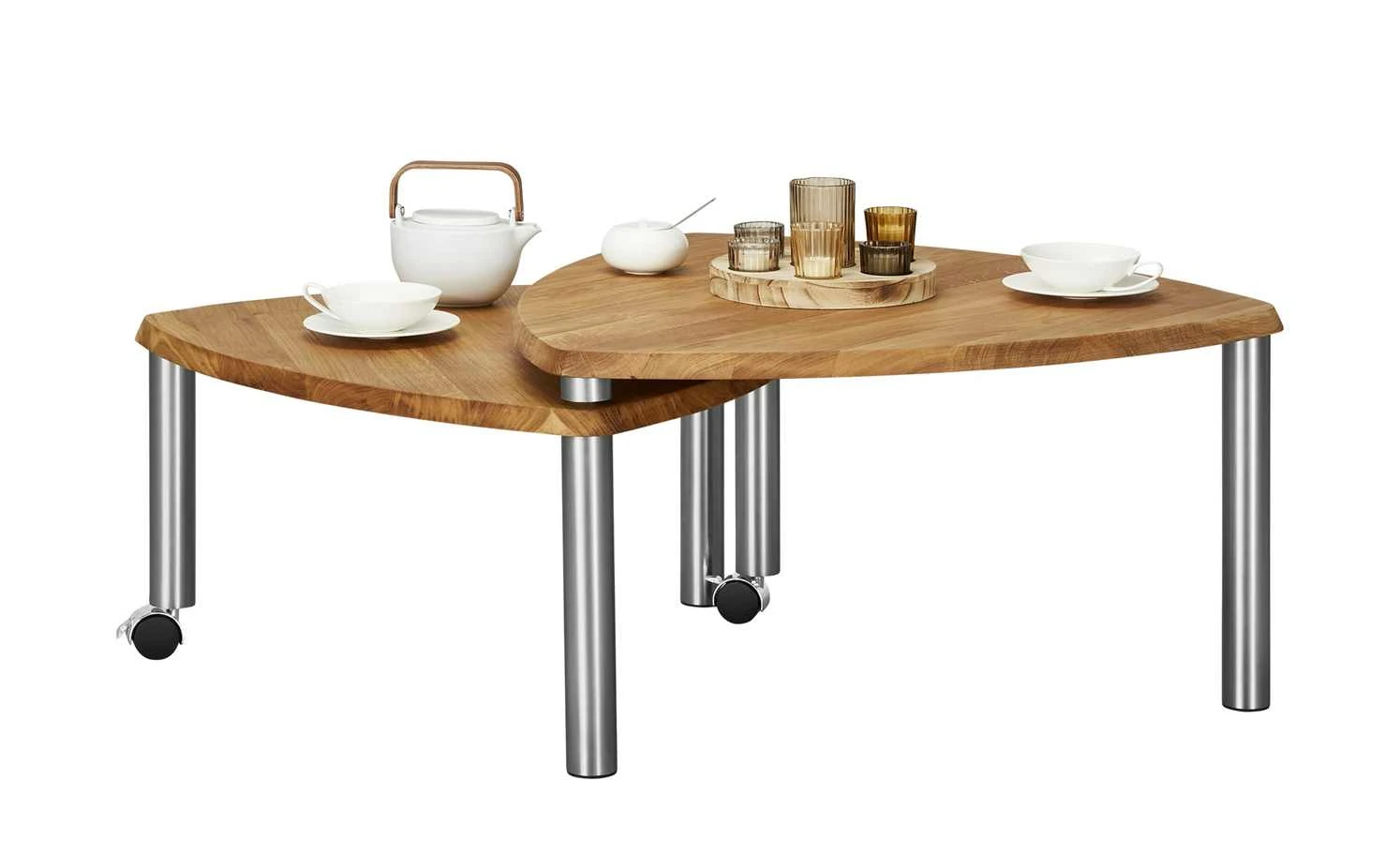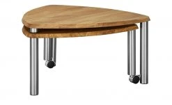 Kleiner oder großer Couchtisch – warum entscheiden? Der Couchtisch Vilm kann beides sein. Der Tisch ist im Handumdrehen vergrößerbar. Dazu drehen Sie einfach nur den zweiten Ablagetisch aus. Er ist mit Rollen ausgestattet, so dass Sie ihn ganz leicht bewegen können. Wenn Sie ihn nicht mehr benötigen, wird er einfach wieder unter dem eigentlichen Couchtisch verstaut. Tischplatte und Ablage bestehen aus massiver Wildeiche. Die Holzoberfläche ist zum Schutz geölt worden. Das edle Holz fällt durch seine rustikale Maserung auf. Die nickelfarbigen Metallbeine setzen moderne Akzente.