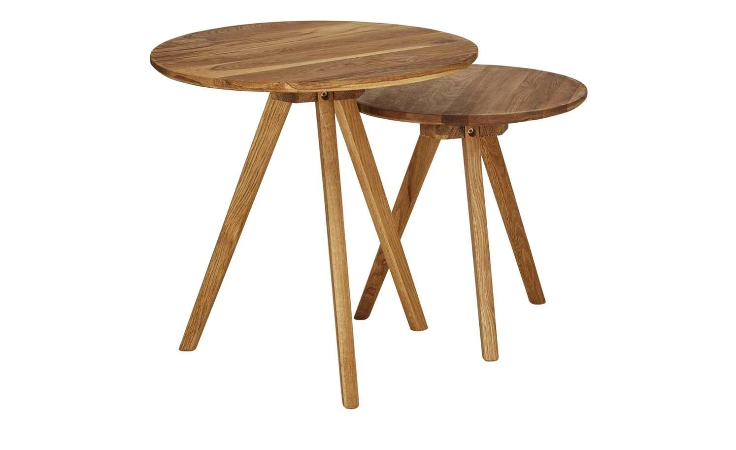Rotonda ist ein Set aus zwei kleinen Couchtischen. Sie können sie einzeln oder zusammen platzieren. Beide Tischchen sind aus massiver Eiche gefertigt. Ihre Holzoberfläche ist mit einem Öl versiegelt worden. Die Tischplatten sind rund und werden von drei Tischbeinen getragen. Das schlichte, natürliche Design mit Retronote gibt den Tischen einen skandinavischen Look.