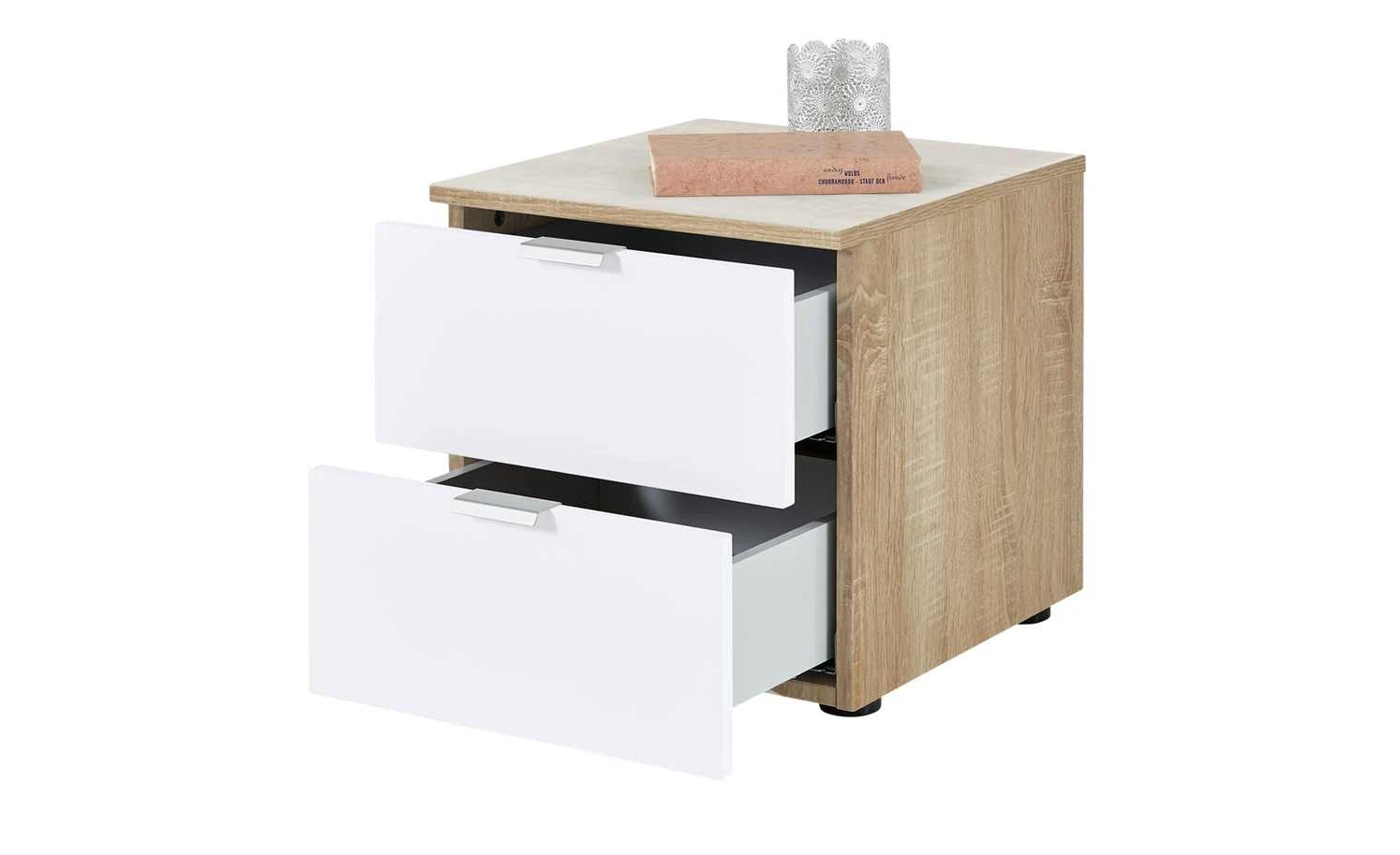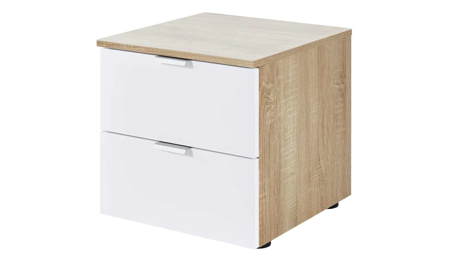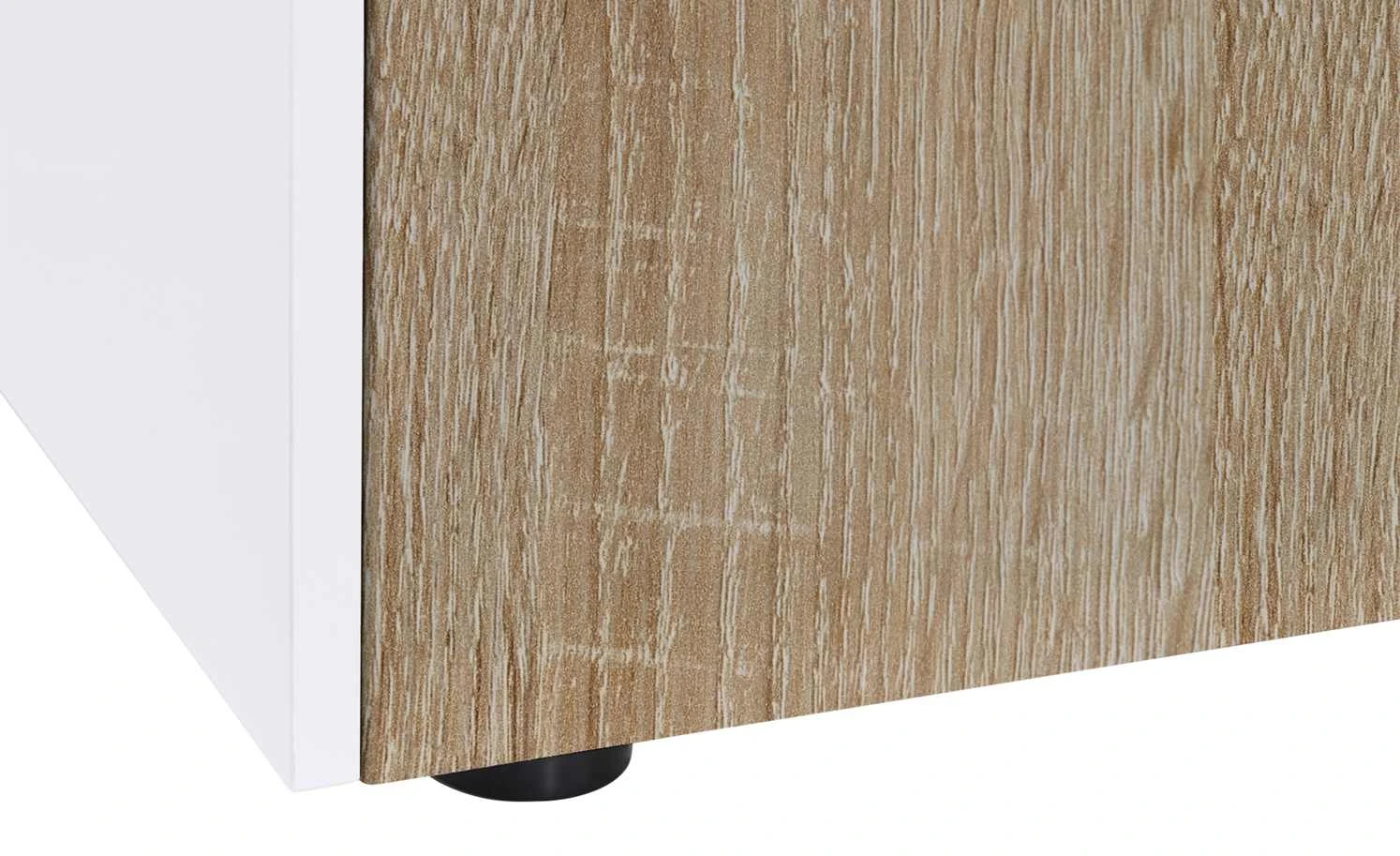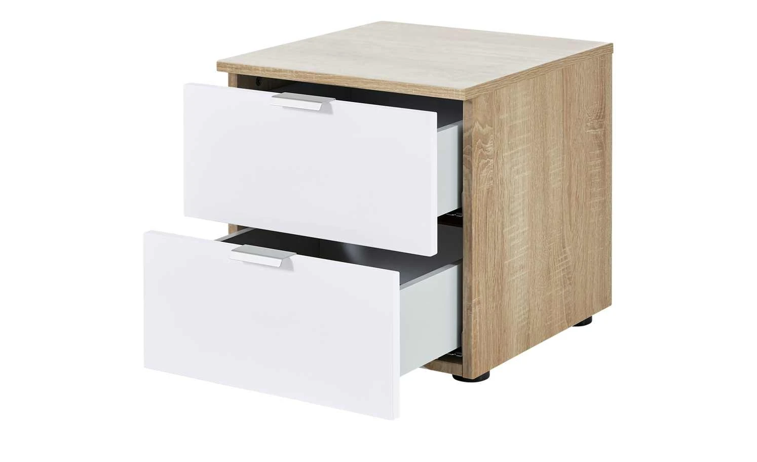 Passend zum Schrank Dreamer und dem gleichnamigen Sideboard ist diese Nachtkommode. Sie ist mit zwei Schubfächern ausgestattet. Diese haben einen sogenannten Softeinzug. Das heißt, dass die Schubladen leise schließen. Die alufarbigen Griffe sind aus Metall und setzen Akzente. Dreamer fällt durch seine strahlend weiße Front auf. Sie hat einen eleganten Glanz. Kontrastreich dazu ist der Korpus in Eiche sägerau (Nachbildung).