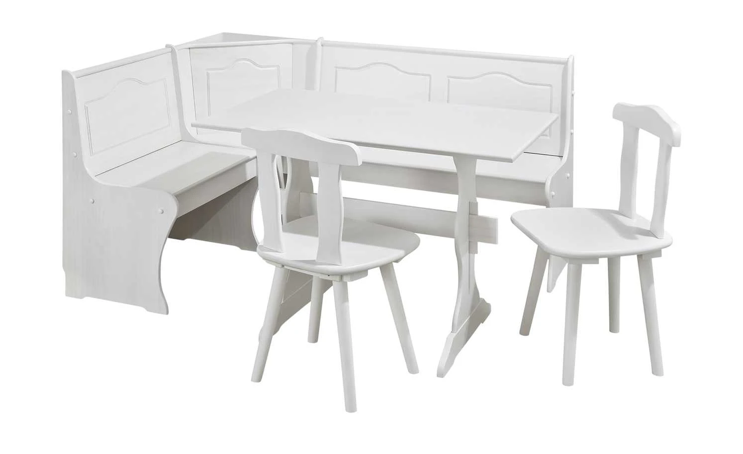 Die Eckbankgruppe Lasse ist perfekt für die Wohnküche. Die Gruppe besteht aus vier Teilen: Bank, Tisch und zwei Stühlen. Die Bank selbst nutzt Ecken praktisch aus und bietet eine Sitzfläche für mehrere Personen. Auch praktisch: Die Sitzfläche lässt sich hochklappen und der Platz unter der Klappe als Staumöglichkeit nutzen. Alle vier Elemente sind aus massiver Kiefer gefertigt und deshalb besonders stabil und langlebig. Die Oberflächen sind lackiert worden, um das Holz zu versiegeln und so zu schützen. Dadurch hat das Holz einen schönen Weißton erhalten. Die typische Holzmaserung ist dennoch wunderbar zu erkennen und harmoniert mit den Landhausverzierungen der Gruppe.