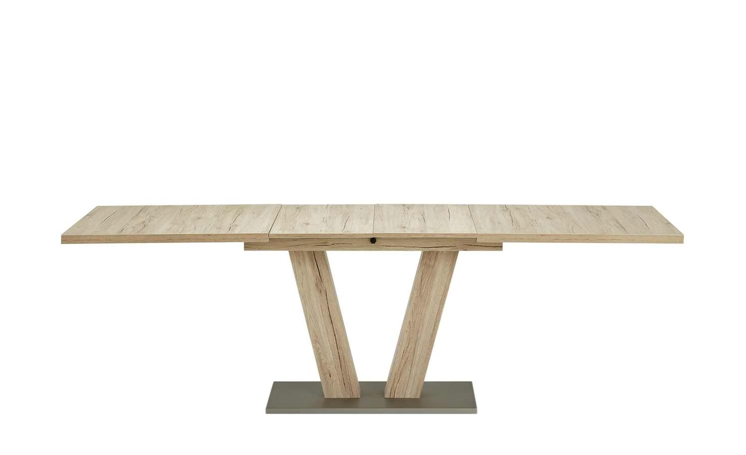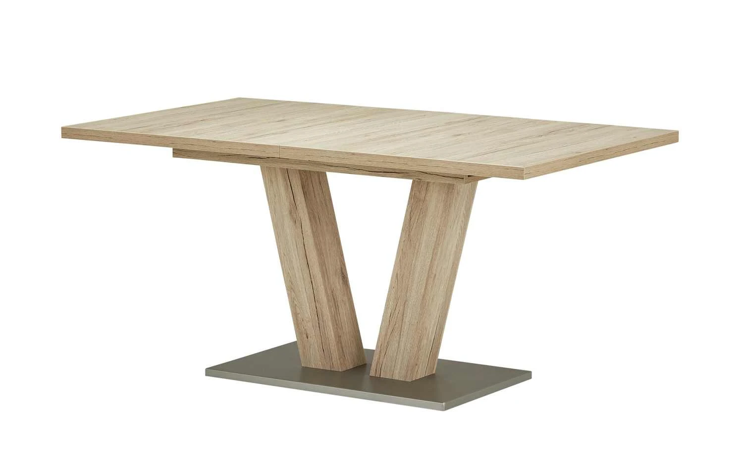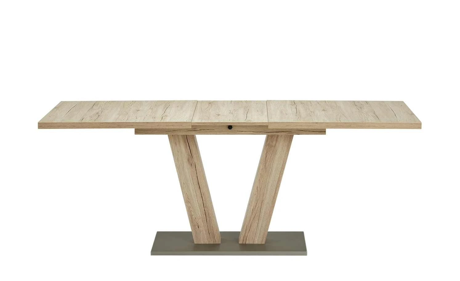 Und plötzlich kommen mehr Gäste als gedacht. Mit dem Esstisch 1063 finden Sie Platz für alle. Der Tisch kann bei Bedarf einfach ausgezogen und mit zwei Platten à 40 cm erweitert werden. So können bis zu zehn Personen bequem an ihm sitzen. Tischplatte und Gestell sind melaminbeschichtet. Das macht die Oberflächen besonders robust und pflegeleicht. Die Holzoptik (Nachbildung) sieht natürlich aus. Ein Eyecatcher ist das Gestell in V-Form.