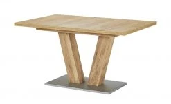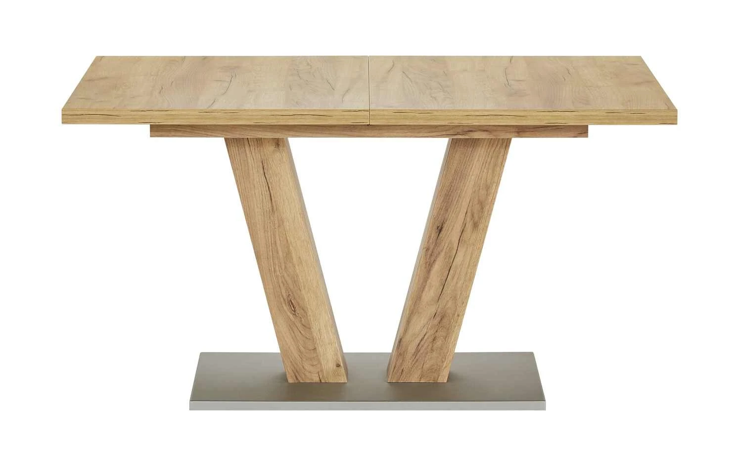 Und plötzlich kommen mehr Gäste als gedacht. Mit dem Esstisch 1063 finden Sie Platz für alle. Der Tisch kann bei Bedarf einfach ausgezogen und mit zwei Platten à 40 cm erweitert werden. So können bis zu zehn Personen bequem an ihm sitzen. Tischplatte und Gestell sind melaminbeschichtet. Das macht die Oberflächen besonders robust und pflegeleicht. Die Holzoptik (Nachbildung) sieht natürlich aus. Ein Eyecatcher ist das Gestell in V-Form.