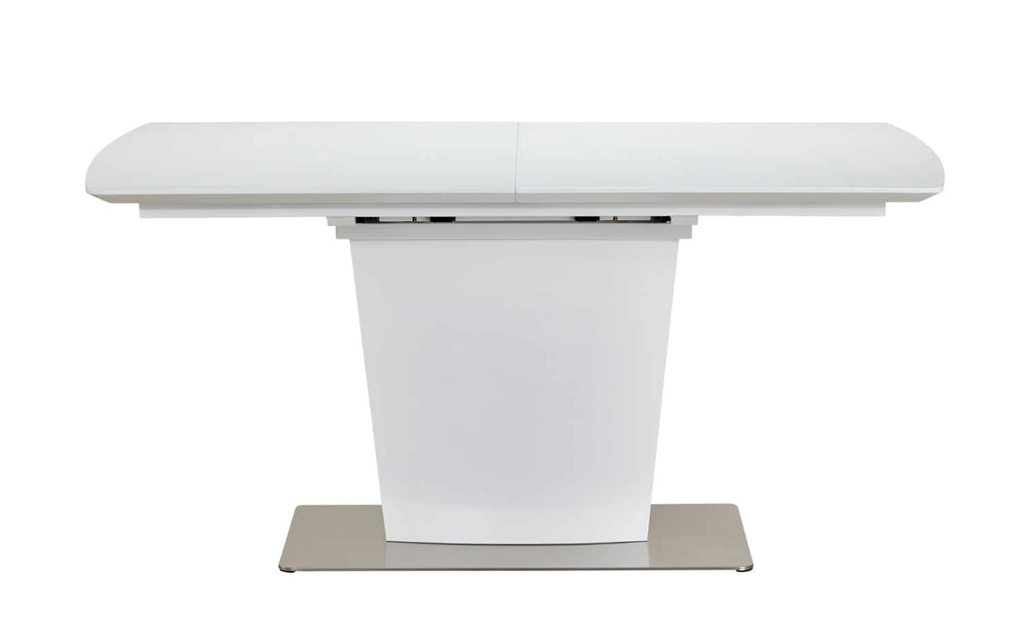 Platz für die gesamte Familie oder viele Freunde bietet Ihnen der Esstisch Dean. Bei Bedarf können Sie ihn einfach verlängern. Möglich macht das die praktische Auszugsfunktion mit Mittelauszug. Das heißt, die Tischplatte wird auseinandergezogen und die mittig unter der Tischplatte versteckte Platte wird ausgeklappt. Dean ist komplett in Weiß gehalten, nur die Bodenplatte und die Absetzungen am Gestell setzen Akzente. Diese sind aus Metall und matt gebürstet. Die Tischplatte ist aus robustem und pflegeleichtem Glas.