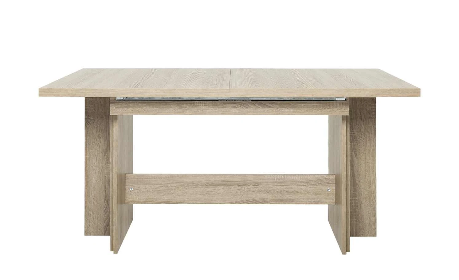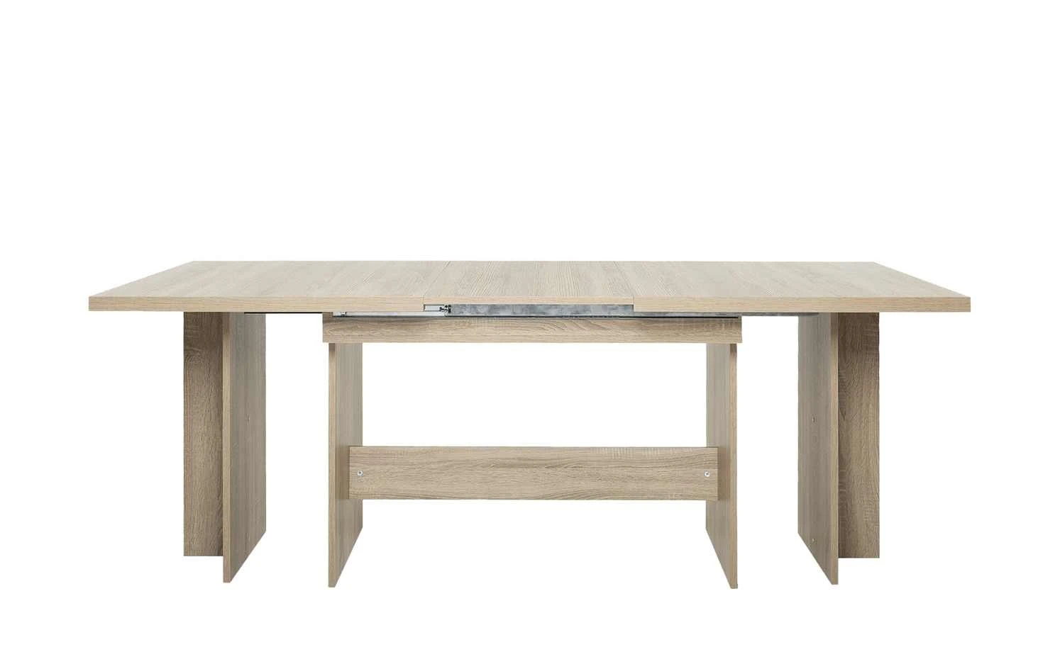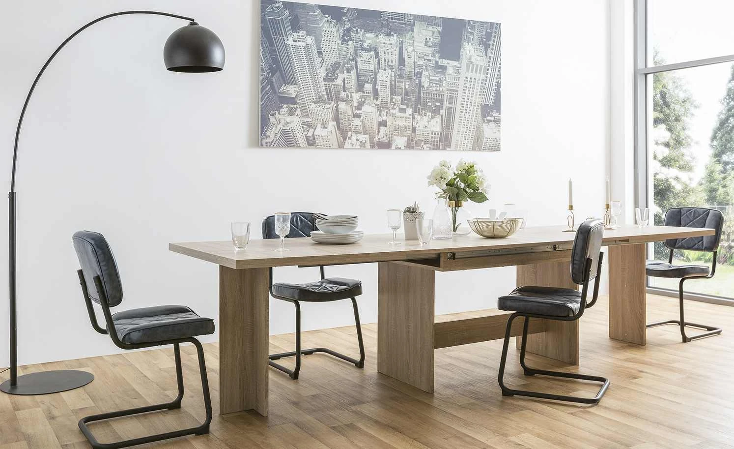 Der Esstisch Fabio ist so flexibel wie Sie möchten. Er verfügt über einen praktischen Mittelauszug inklusive drei Auszugsplatten. Dabei kann der Tisch in 50 Zentimeter-Schritten auf bis zu 310 Zentimeter Länge ausgezogen werden. Unter halb der Tischplatte gibt es einen Innenkasten, indem die Platten platzsparend aufbewahrt werden können. Fabio hat eine Oberfläche aus Melaminharz und ist deshalb besonders widerstandsfähig. Das Dekor in Eiche sägerau (Nachbildung) macht den Tisch gut kombinierbar.