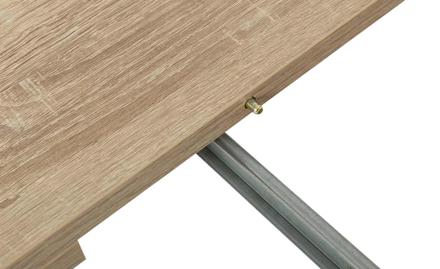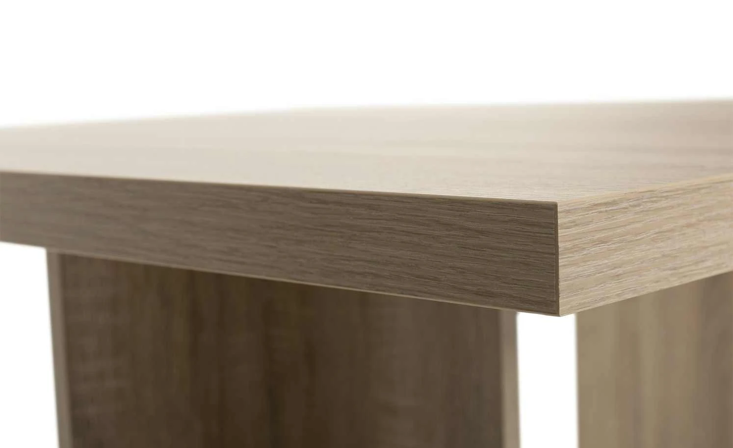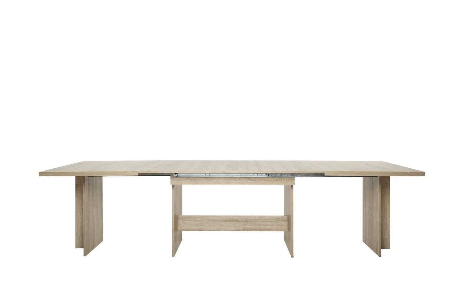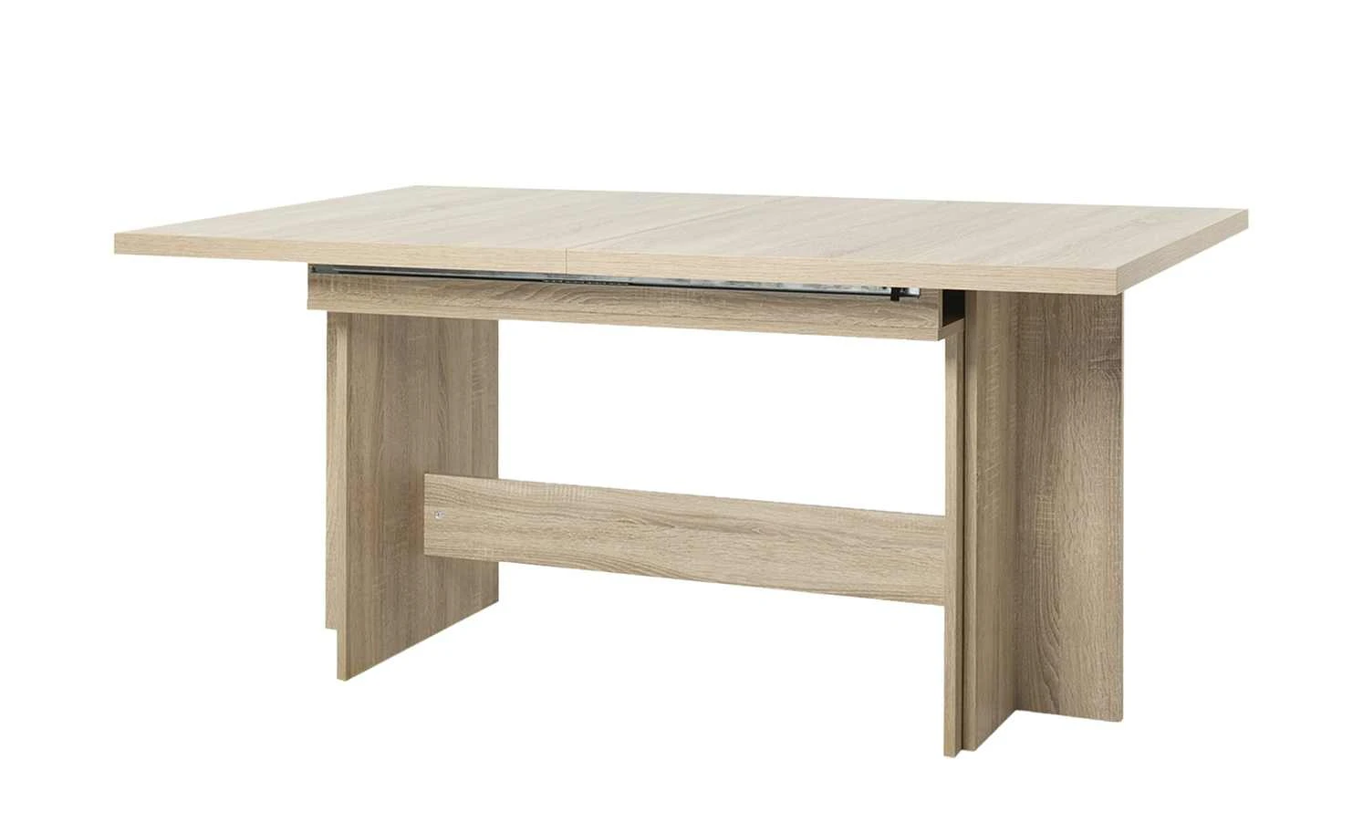 Der Esstisch Fabio ist so flexibel wie Sie möchten. Er verfügt über einen praktischen Mittelauszug inklusive drei Auszugsplatten. Dabei kann der Tisch in 50 Zentimeter-Schritten auf bis zu 310 Zentimeter Länge ausgezogen werden. Unter halb der Tischplatte gibt es einen Innenkasten, indem die Platten platzsparend aufbewahrt werden können. Fabio hat eine Oberfläche aus Melaminharz und ist deshalb besonders widerstandsfähig. Das Dekor in Eiche sägerau (Nachbildung) macht den Tisch gut kombinierbar.