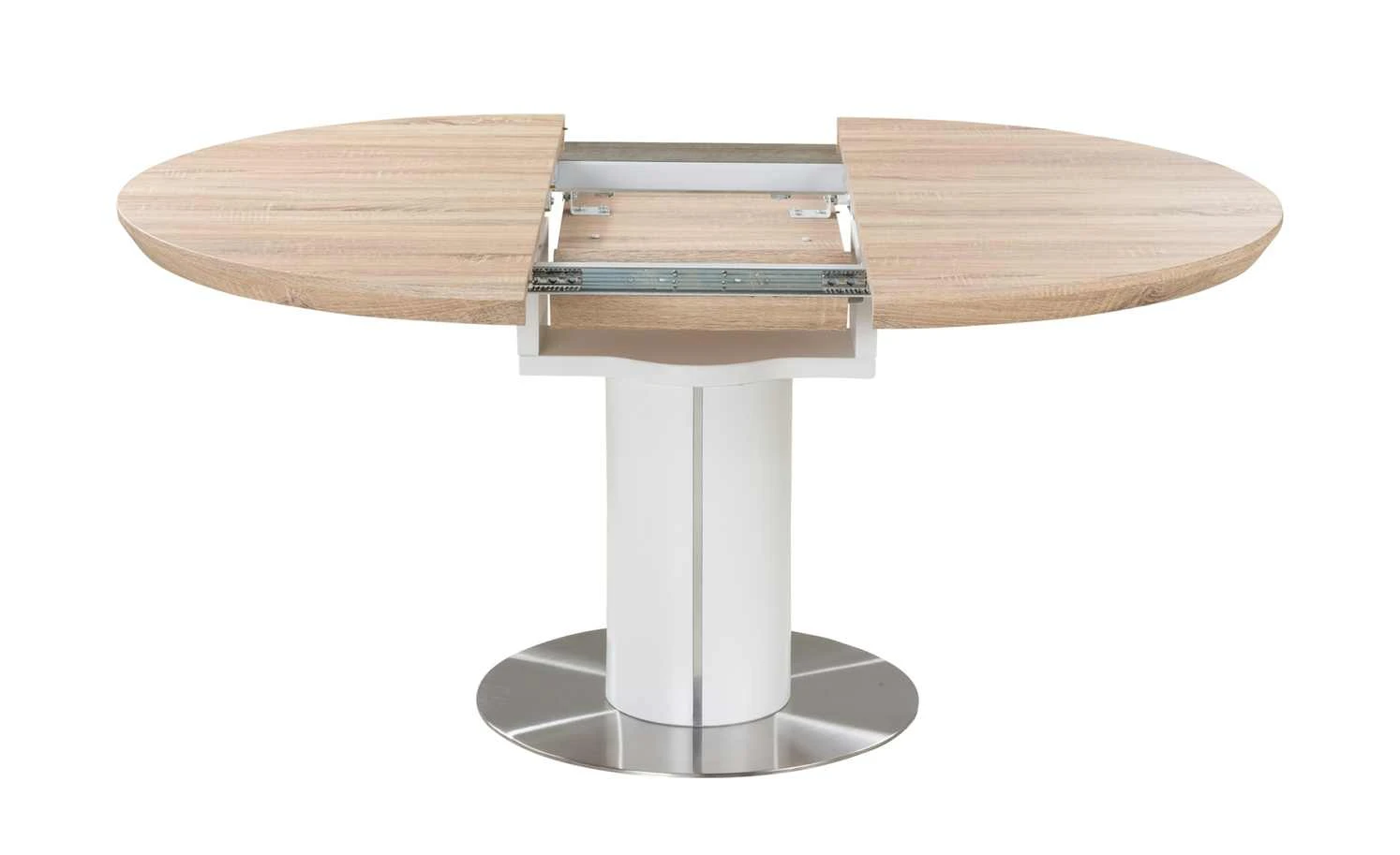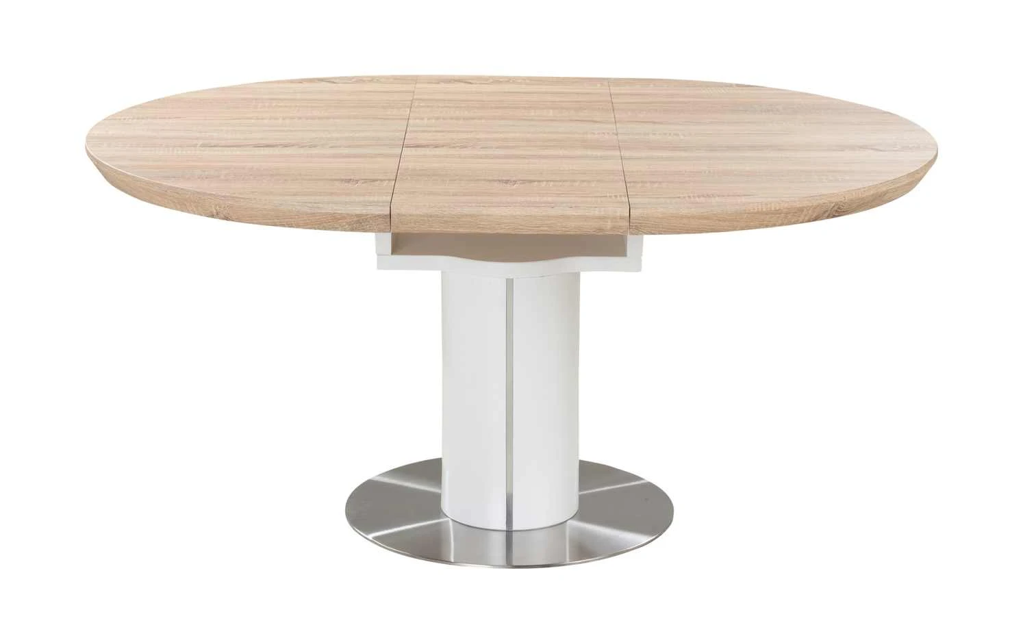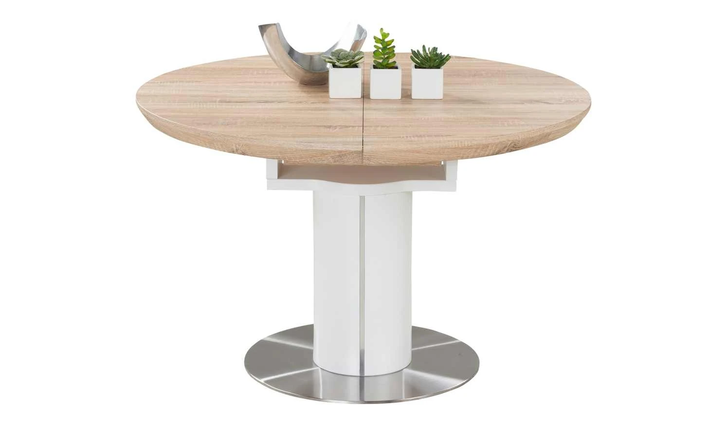 Mit dem Esstisch Harvey haben Sie einen größenverstellbaren Tisch, an dem je nach Bedarf bis zu 8 Personen komfortabel für gemeinsame Mahlzeiten Platz finden. Um den runden Esstisch in eine Tafel zu verwandeln, müssen Sie die geteilte Tischplatte nur an beiden Längsseiten auseinander ziehen. Schon kommt eine zusätzliche Platte zum Vorschein, die Sie mit wenigen Handgriffen in der Mitte einsetzen können. Die moderne Optik mit dem einzelnen, weißlackierten Standbein und dem Fuß aus Chrom steht in angenehmem Kontrast zur Tischplatte in Eiche sägerau (Nachbildung), die dem Esstisch einen rustikalen Akzent verleiht.