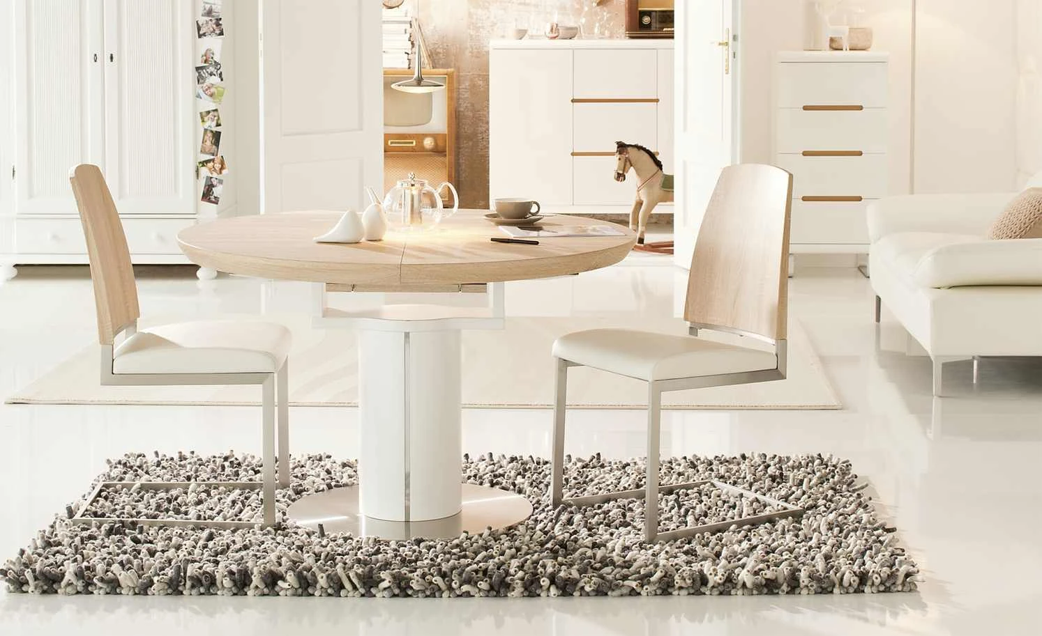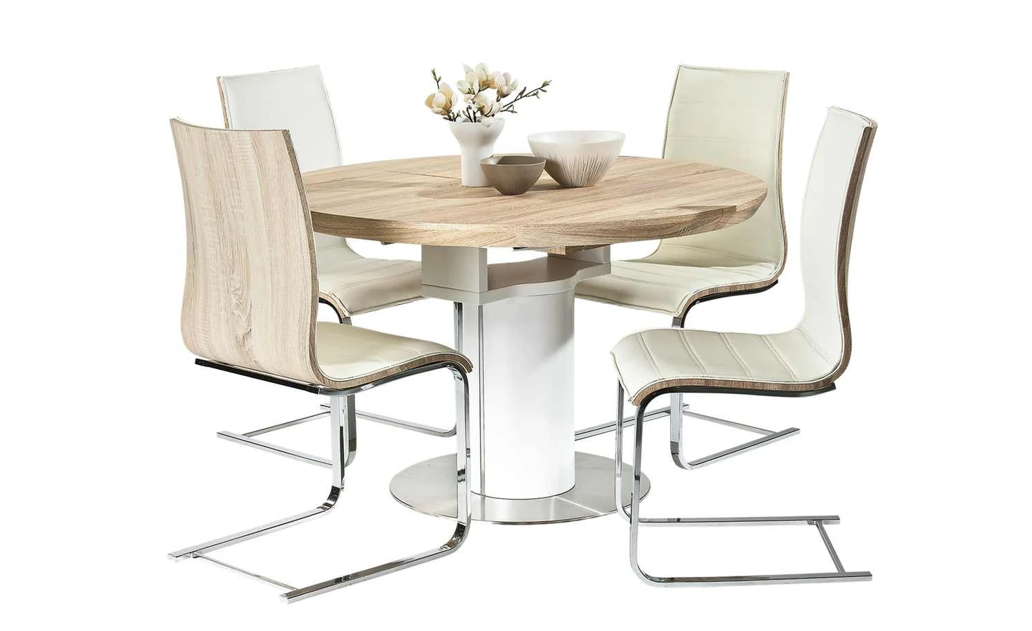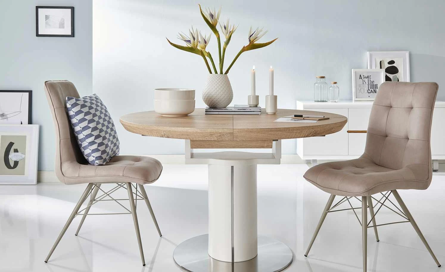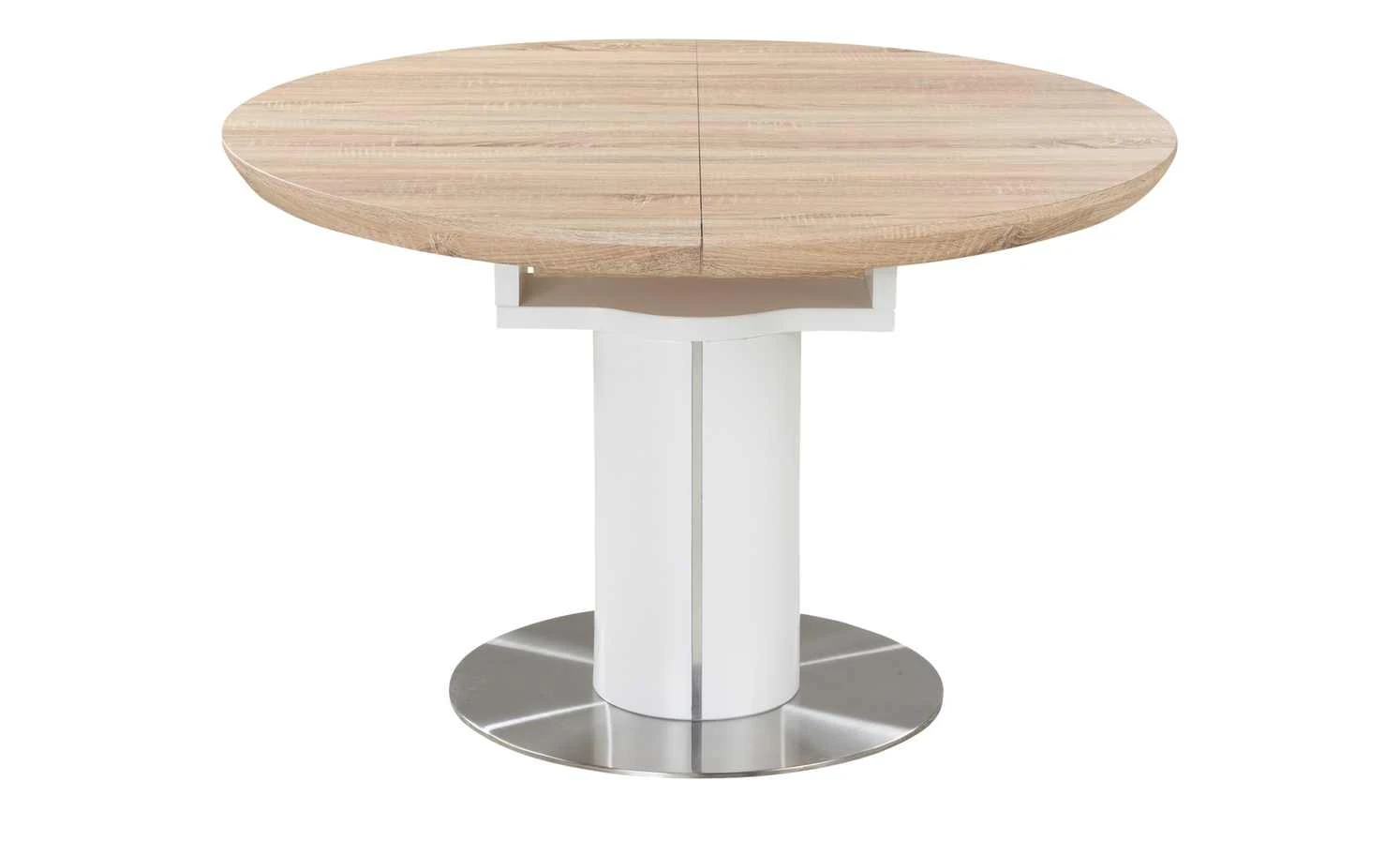 Mit dem Esstisch Harvey haben Sie einen größenverstellbaren Tisch, an dem je nach Bedarf bis zu 8 Personen komfortabel für gemeinsame Mahlzeiten Platz finden. Um den runden Esstisch in eine Tafel zu verwandeln, müssen Sie die geteilte Tischplatte nur an beiden Längsseiten auseinander ziehen. Schon kommt eine zusätzliche Platte zum Vorschein, die Sie mit wenigen Handgriffen in der Mitte einsetzen können. Die moderne Optik mit dem einzelnen, weißlackierten Standbein und dem Fuß aus Chrom steht in angenehmem Kontrast zur Tischplatte in Eiche sägerau (Nachbildung), die dem Esstisch einen rustikalen Akzent verleiht.