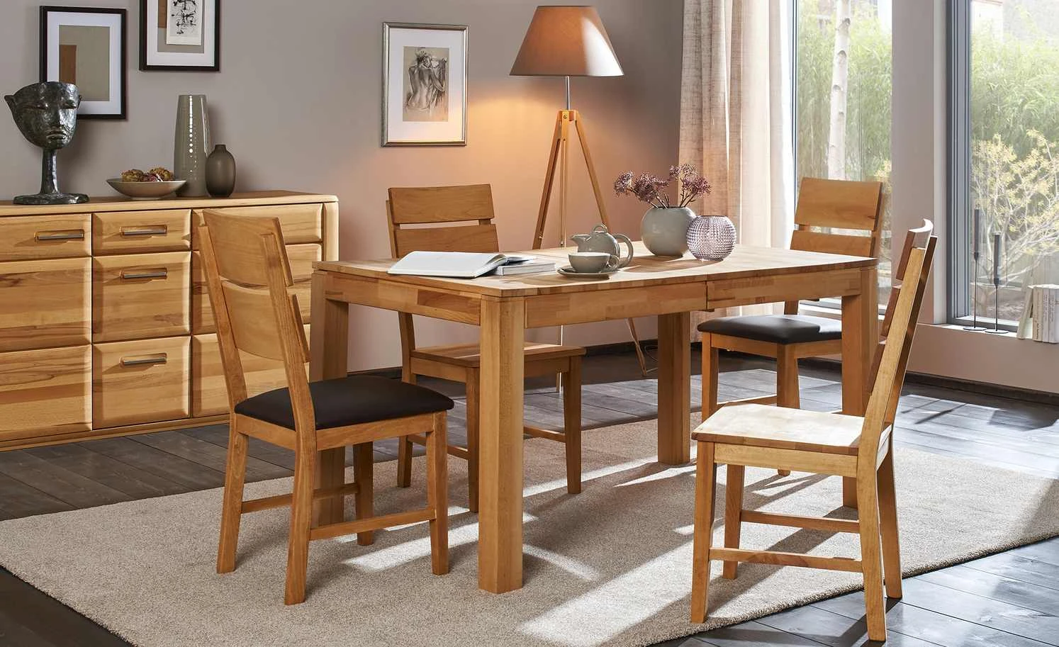 Möbel aus Echtholz sind einfach klasse. Sie zeichnen sich durch Stabilität und Langlebigkeit aus. Und sie verbreiten durch ihre Maserung ein besonders schönes Flair. Bestes Beispiel: der Esstisch Nils, der aus massiver Kernbuche gefertigt ist. Die Holzoberfläche ist geölt, was die Poren des Holzes versiegelt und so einen guten Schutz bietet. Nils ist mit einer Auszugsfunktion ausgestattet. Dabei können Sie den Tisch von 140 auf 200 Zentimeter Länge vergrößern. Statt sechs passen dann sogar acht Personen an den Tisch.